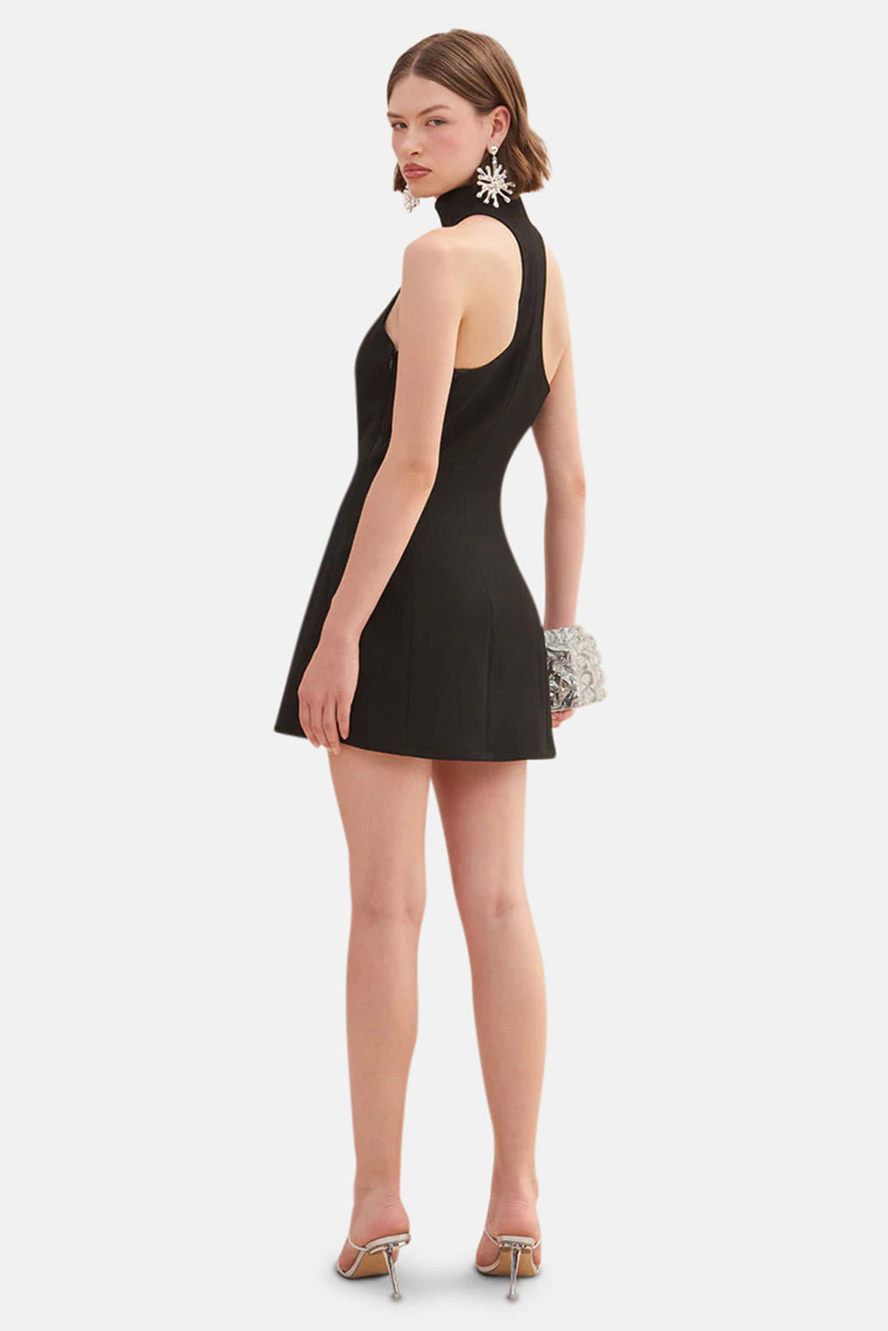 The high collar of the Akaia Dress adds drama to this confident masterpiece of a mini dress. The sleeveless silhouette flows backwards into a racerback style at the back. Structured through the waist to flatter your figure and show off your legs, while a side zip allows for easy wear.