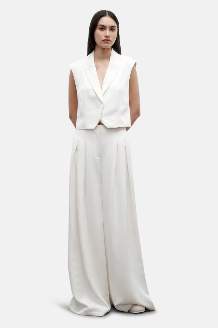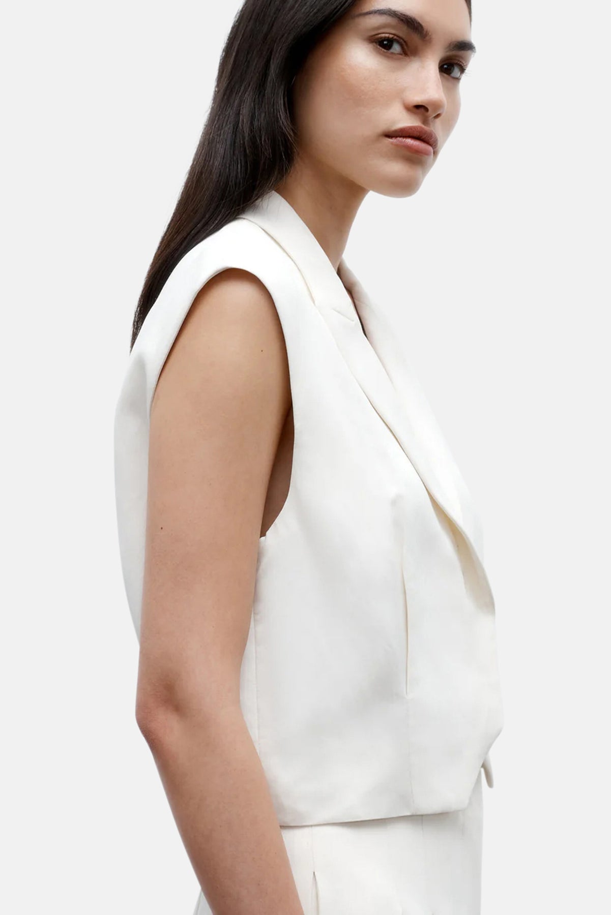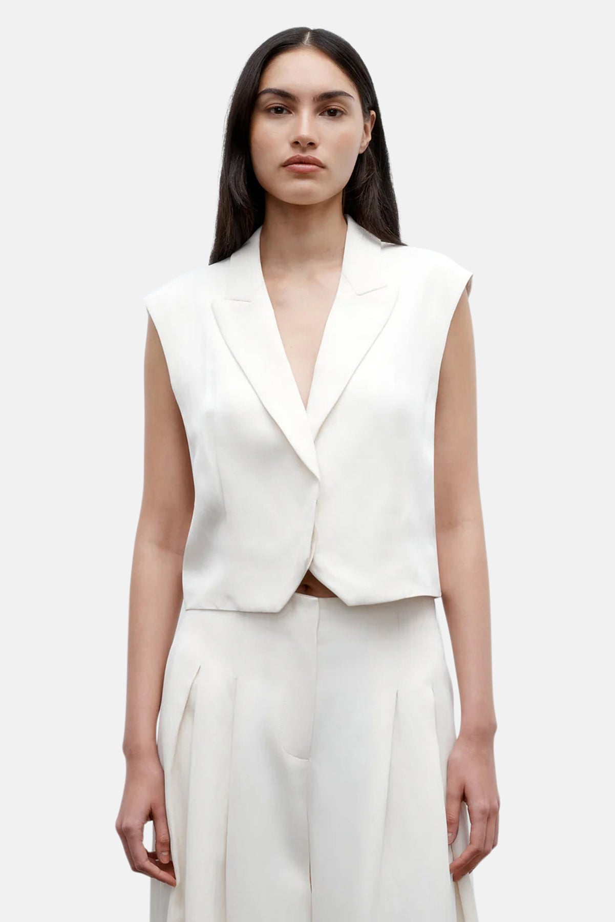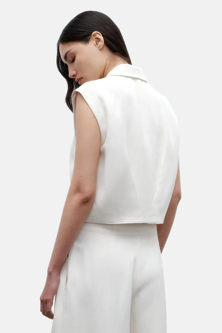 Cropped suit vest in coated viscose linen. We combined a European flax linen, and viscose coating, creating a fabric with a deep color saturation, elegant drape and satiny sheen. The Katie Vest is a boxy fit with inverted pleats at the back. Complete with a concealed placket, peaked lapel and side darts.
