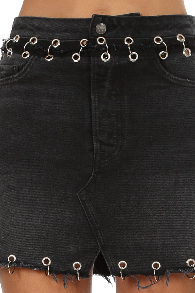 Giving new life to the belt loop, this denim skirt features silver hoops laced through metal grommets for an edgy, innovative spin on a classic jean component. A similar detail lines the raw edge hem for head turning style that stays ahead of the curve.