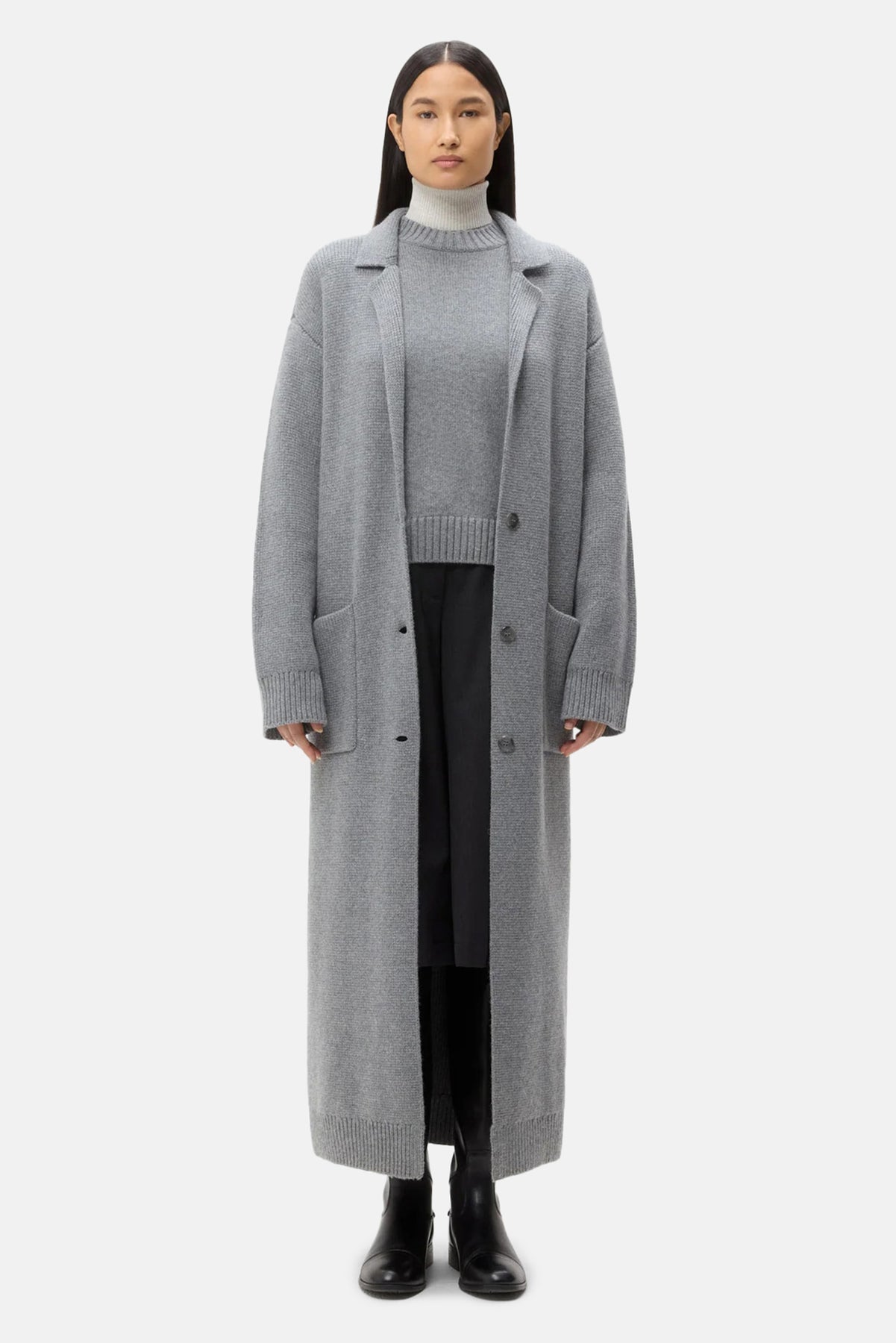 Long, single breasted car coat knitted in cashmere. The Jorden Coat is a narrow silhouette, with a notched lapel. Complete with deep side pockets, single vent and ribbed finish at the cuffs and hem.