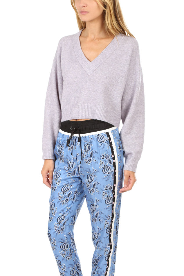 A muted pastel hue imparts an immediate sense of comfort to this loose fitting pullover. Matched with a divinely soft alpaca blend, dolman sleeves, and a broad V neck, this chic and elegant cropped sweater will find itself in heavy rotation in any wardrobe.