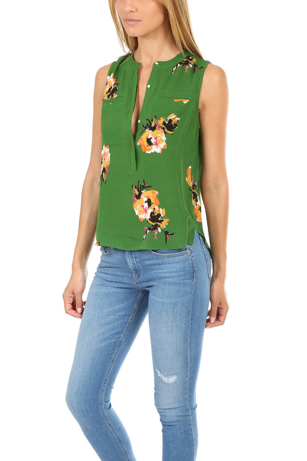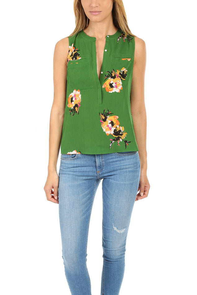 A button front placket lends a casual feel to this sleeveless silk top. Painterly floral print on a kelly green backdrop creates a vibrant exuberance, for an energetic, yet sophisticated aesthetic.
