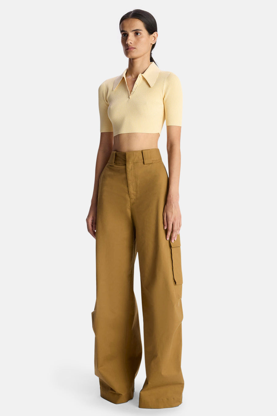 - The Brie Pant is crafted from a compact stretch cotton fabric in a deep camel hue