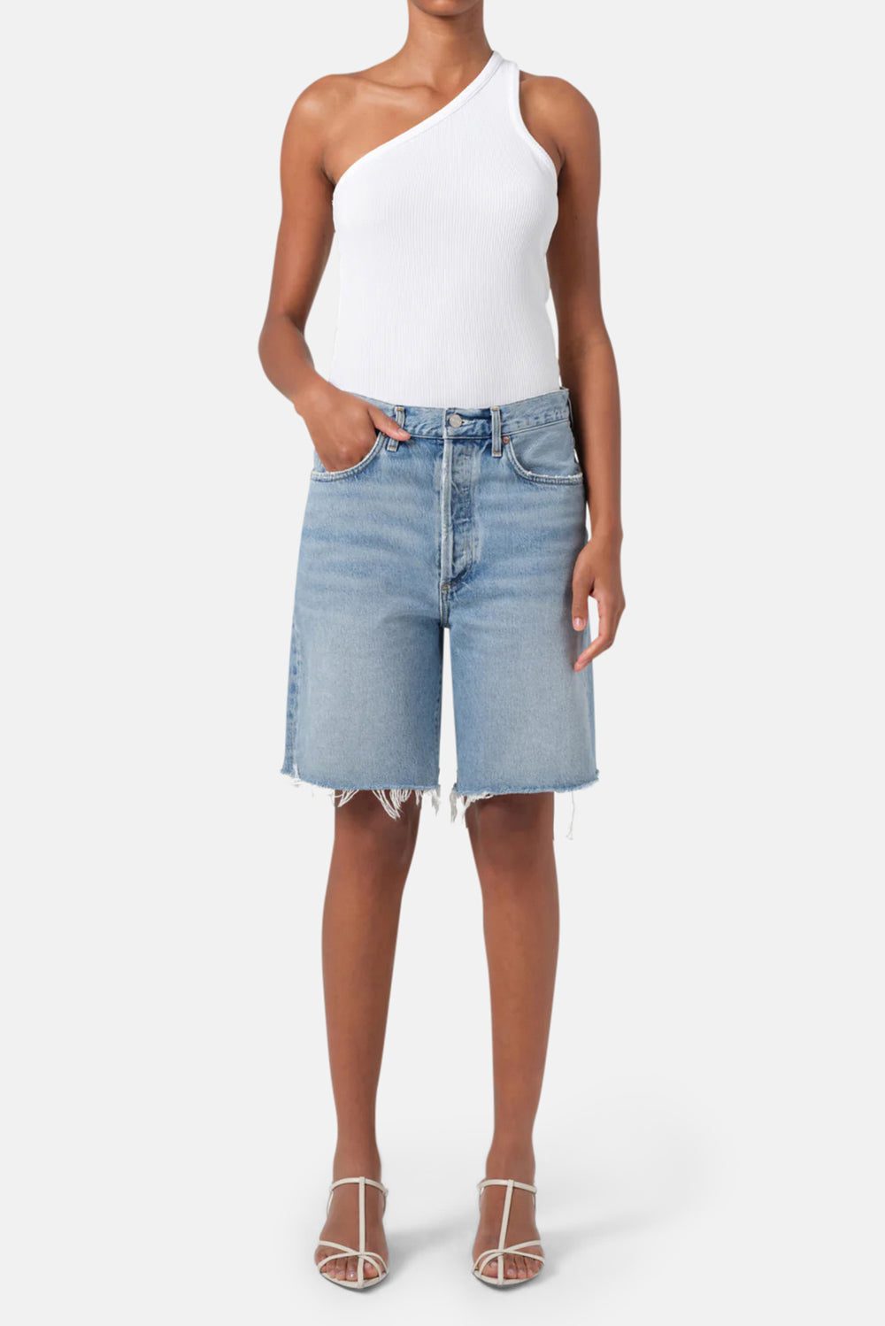 The 90’s Short by Agolde sits relaxed at the waist with a roomy extended inseam that hits just above the knee, offering a laid-back, effortless fit. Crafted from regenerative cotton and vintage marbled light indigo denim, it features subtle fading, whiskering, and a raw hem for a perfectly worn-in look. Style it with a simple white tank and chunky sandals for a relaxed, casual vibe, or pair it with an oversized button-down shirt and slides for a chic, effortless ensemble that takes you from beach days to brunch with ease.