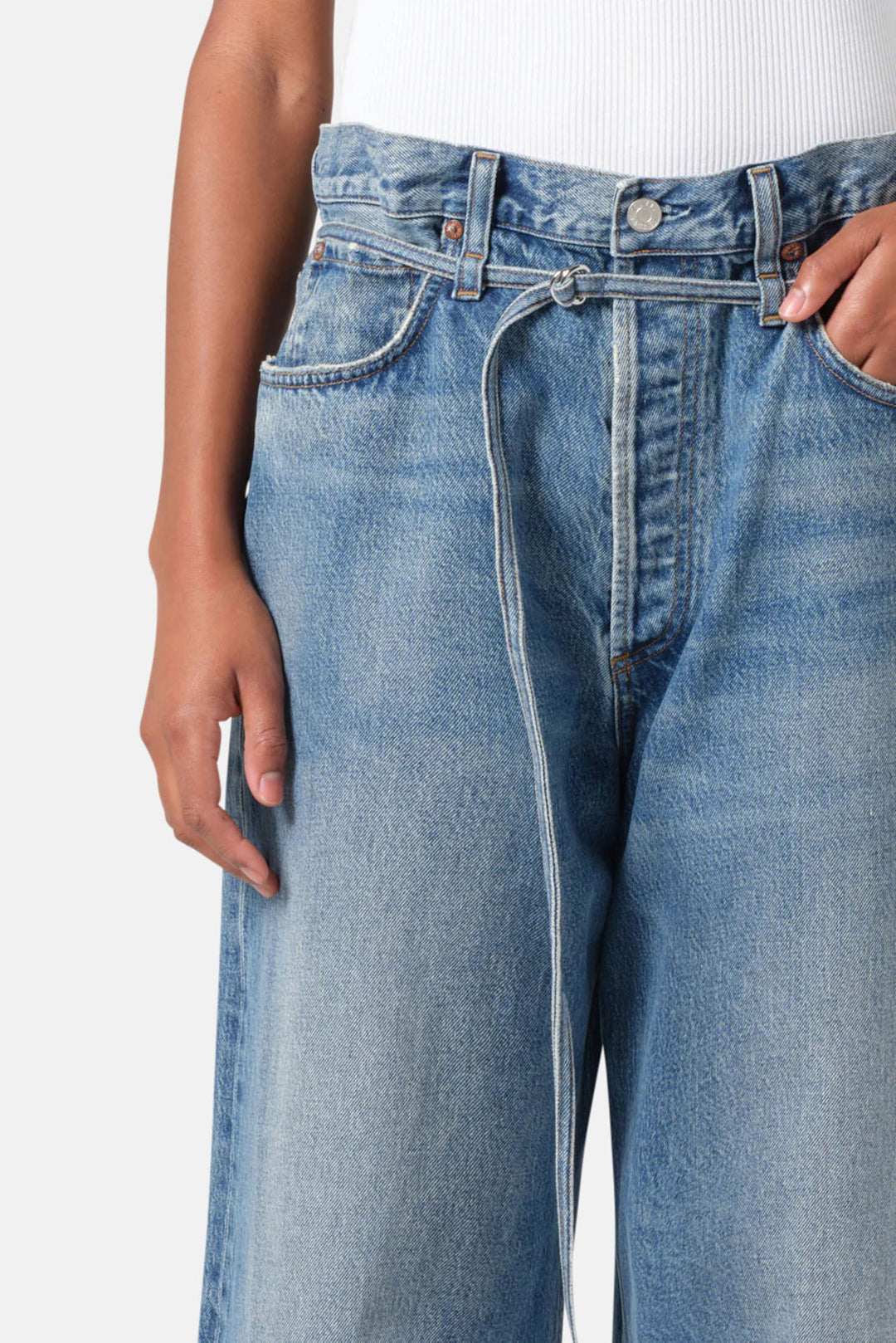 - Worn in medium indigo with fading and whiskering, finished hems