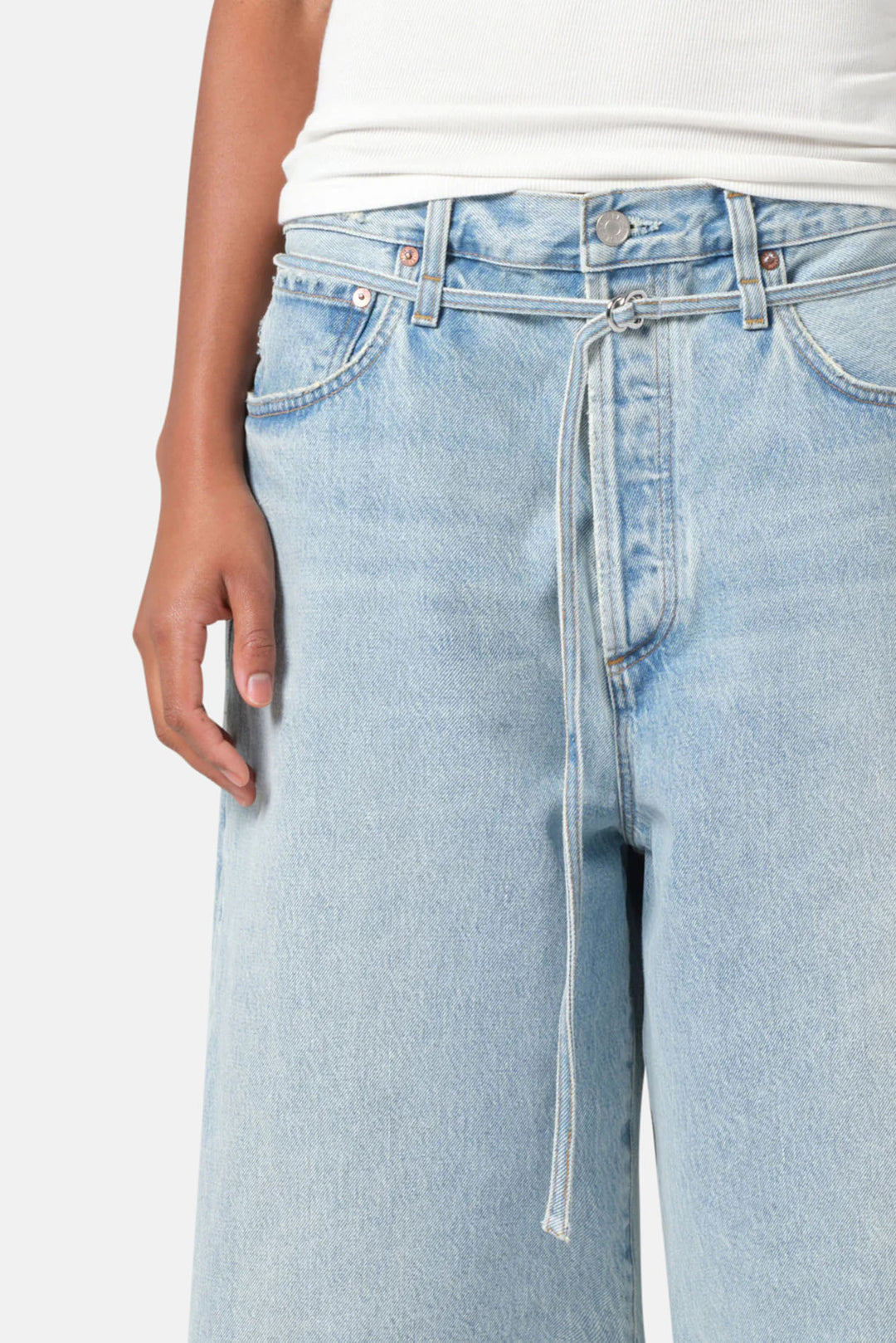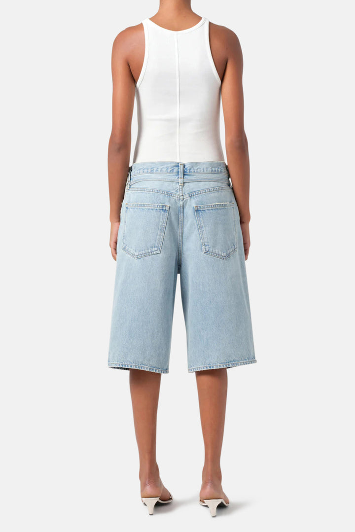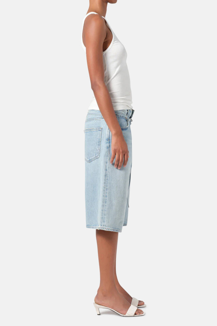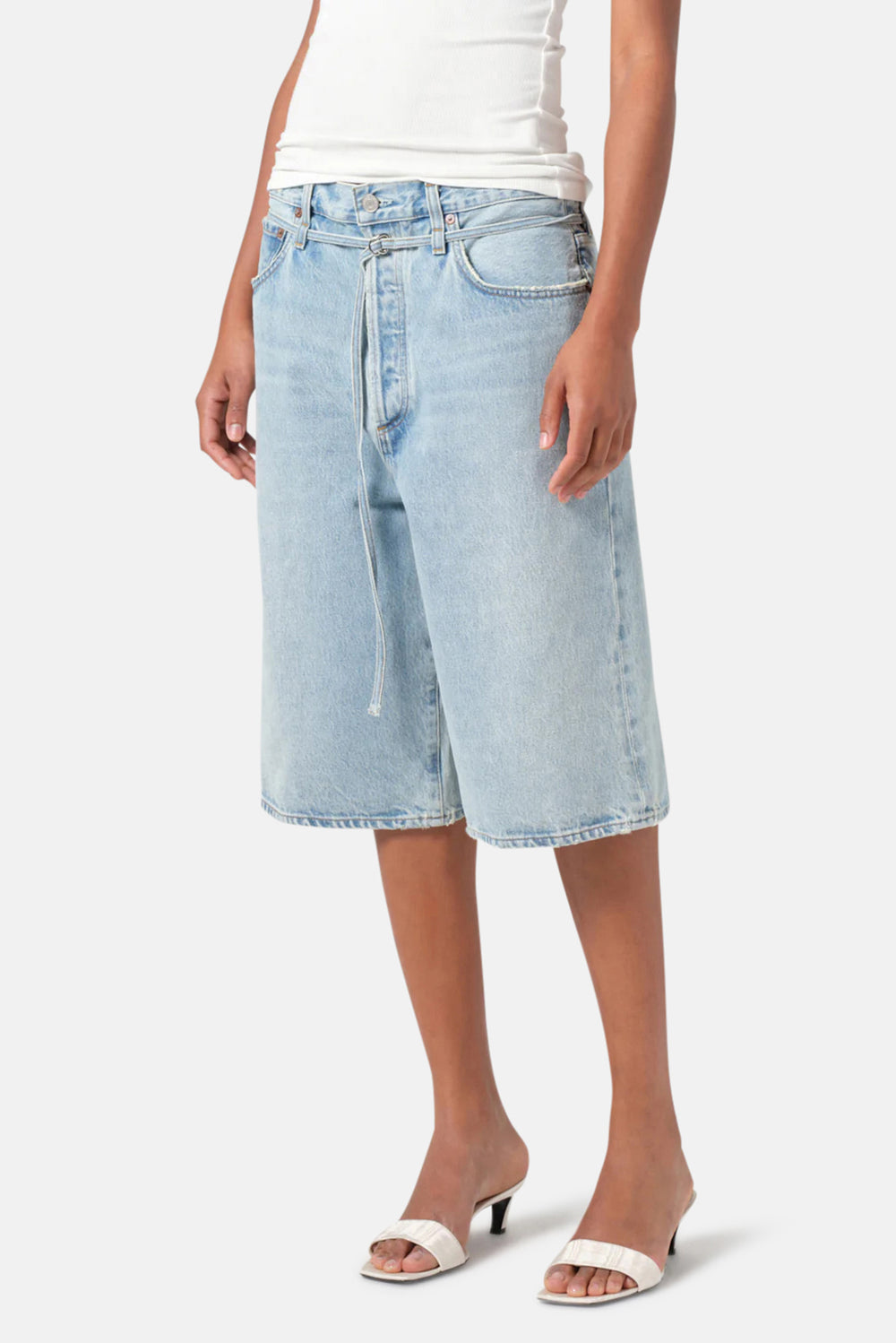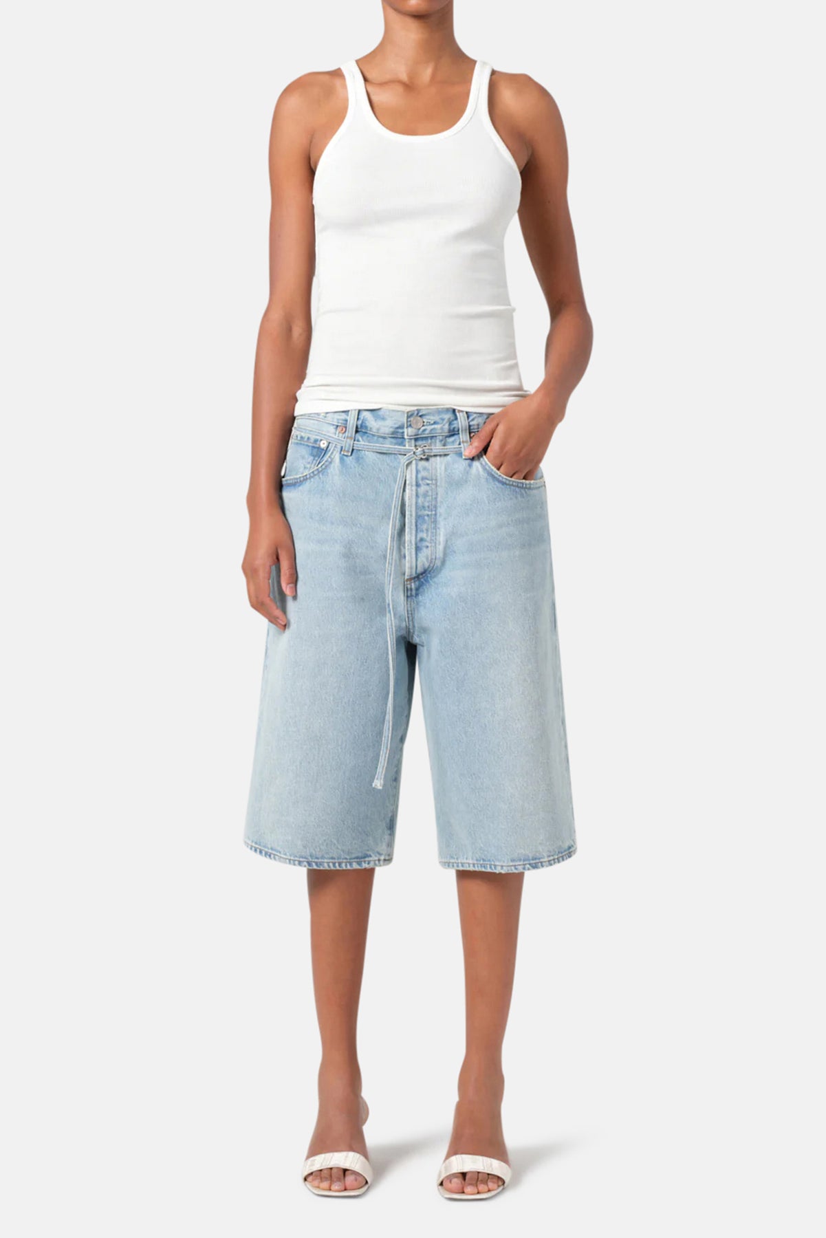 This oversized fit short is not your average pair. It features a long inseam, perfect for a slouchy look, and is cinched with a thin denim belt for added style.
