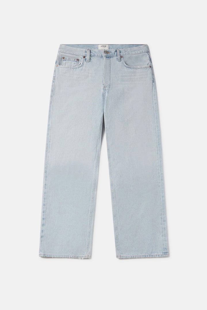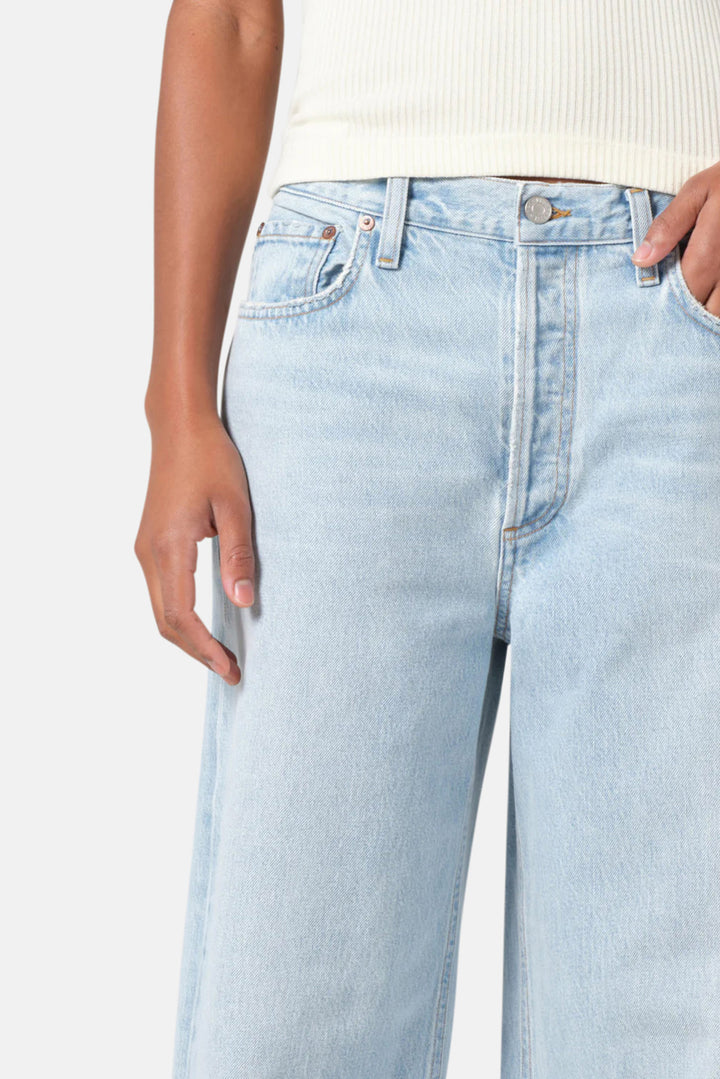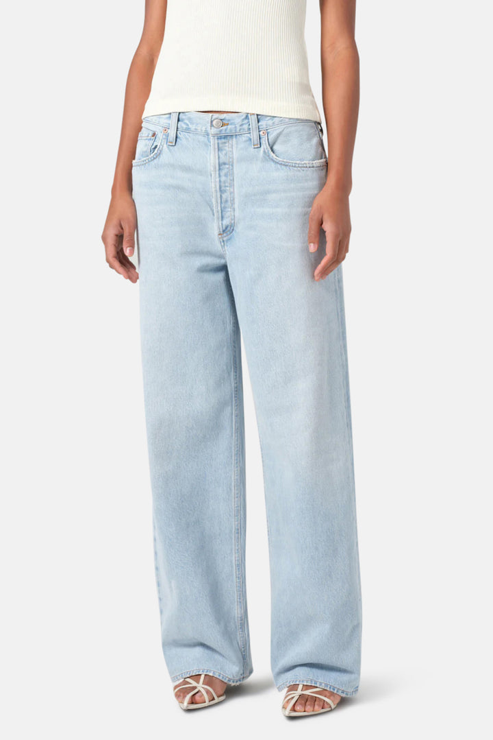 The Low Slung Baggy is crafted from regenerative cotton in light vintage indigo denim, featuring subtle fading, whiskering, and marbling for a perfectly worn-in look. This ultra-relaxed fit sits low on the hips with a baggy straight leg, offering both comfort and effortless style. Pair with a simple tee or oversized sweater for a laid-back yet chic ensemble.