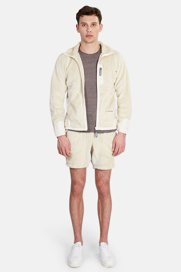 Zip up fleece hoodie made of technical satin and Polartec high-loft fleece. Funnel neck collar and chest zip pocket. White trimming, embroidered logo, large tonal zip pockets.