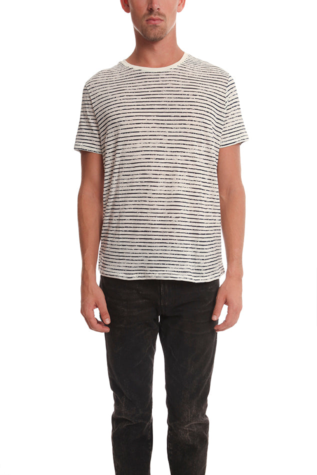 An Anthony Melillo lightweight cotton knit crewneck staple revamped and distressed with stripes. Featured in White/Navy chalk stripes, the tee is super soft, pair this with slim fit denim and a leather jacket.