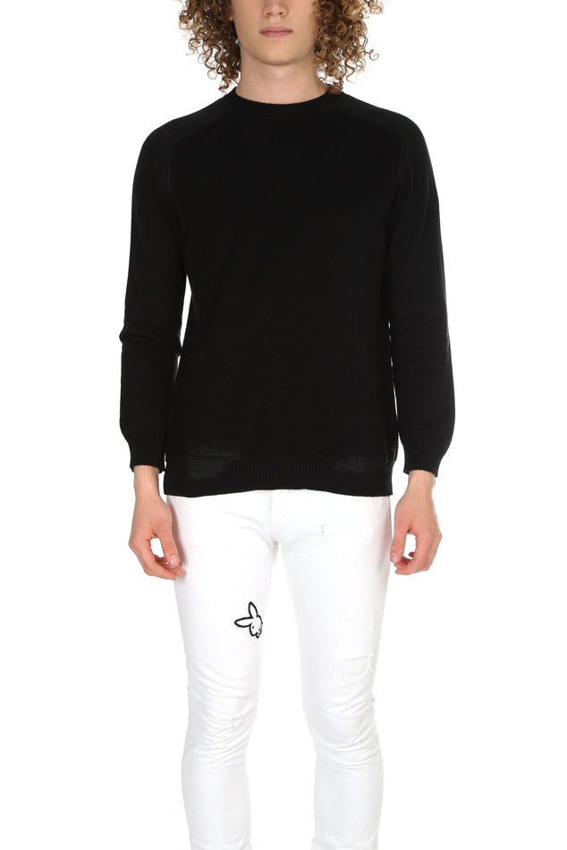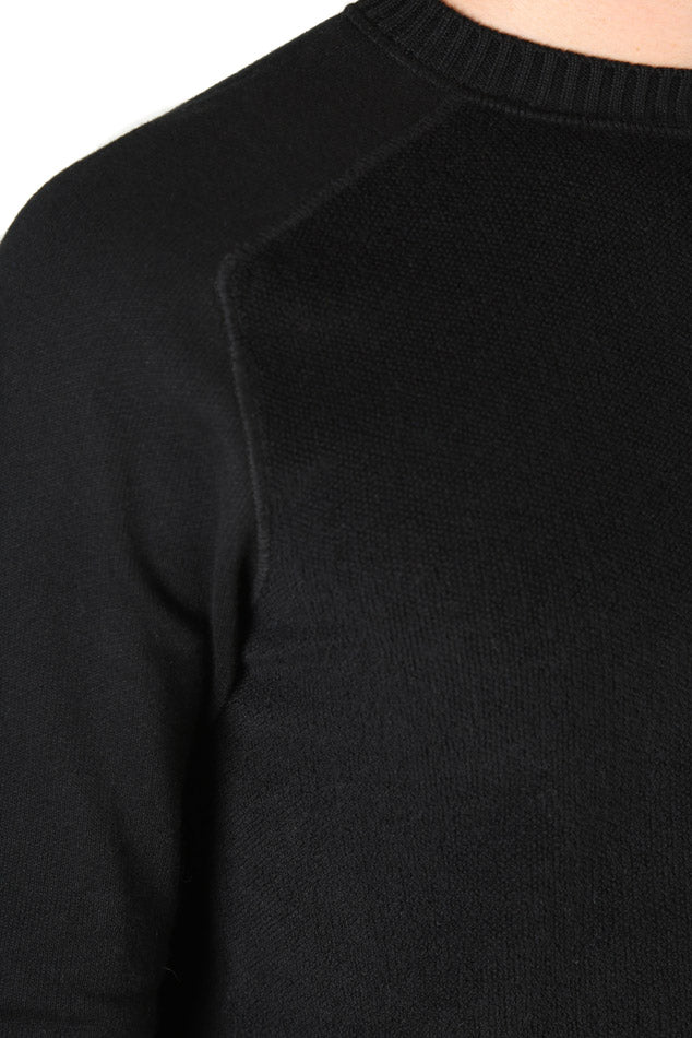 Softly knitted crewneck sweater in black with ribbed neckline. Classic relaxed fit. Terry cloth like fabrication with raglan sleeves. Rib knit cuffing with slight fading around hemlines.