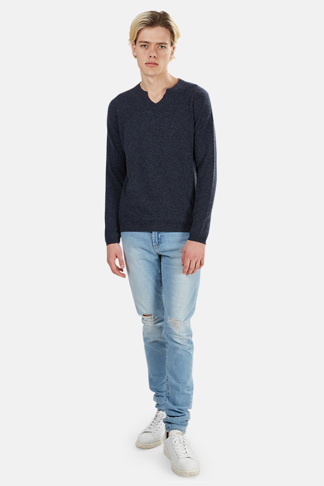 This lightweight cashmere modified v-neck from Blue&Cream is the optimal sweater for a quick touch of casual luxury to any outfit. This nonchalant but edgy answer to comfort is made of 100% tissue thin pure cashmere. Featured here in a Nightsky color, this sweater is optimal with dark denim and boots for a casual look.