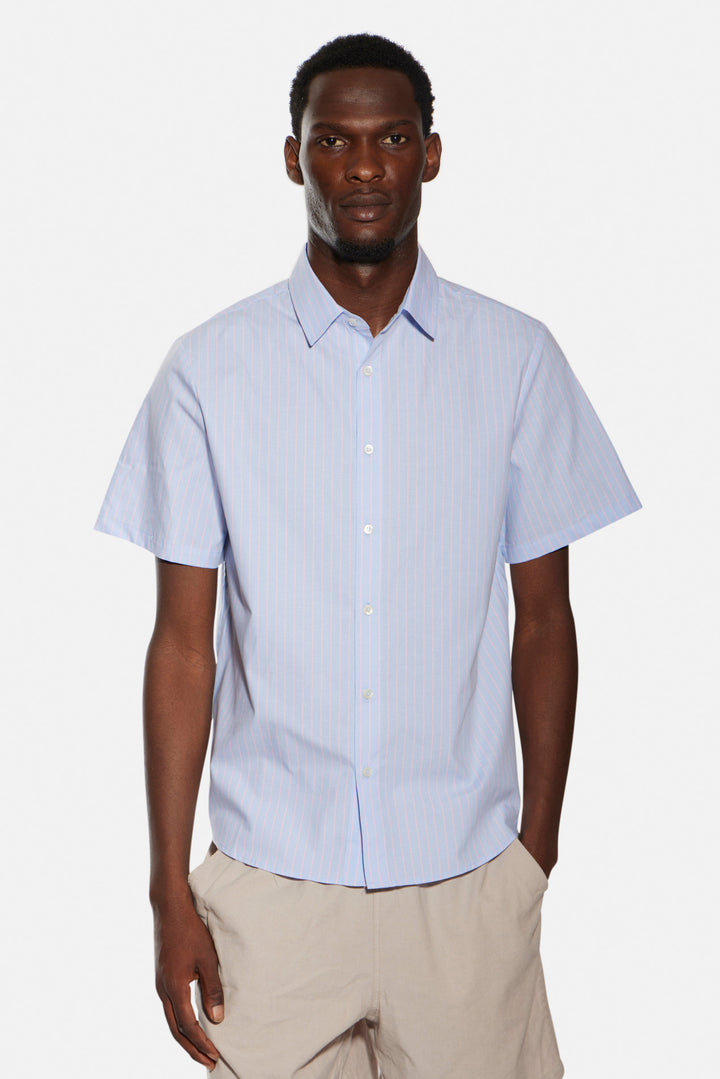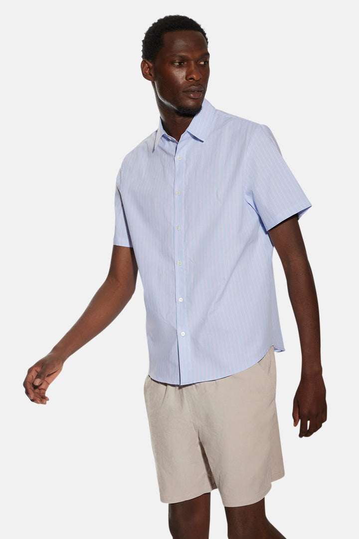 Our Jake short sleeve shirt delivers a crisp, breathable feel in striped cotton poplin—tailored enough to dress up, relaxed enough for everyday.