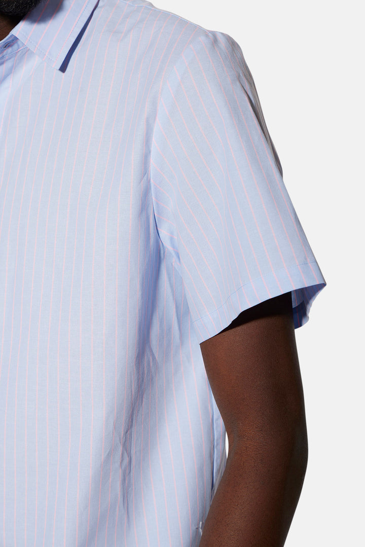 - Crafted from a soft poplin in sky blue with pink pinstripe