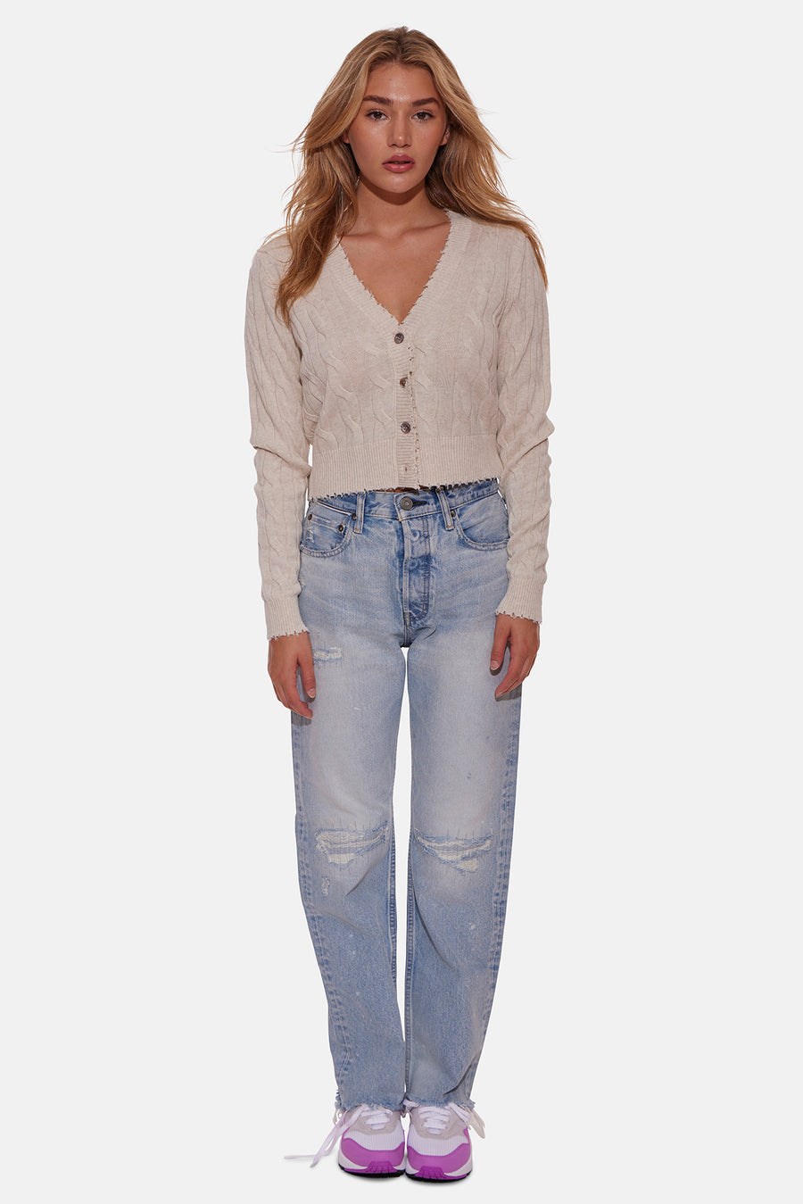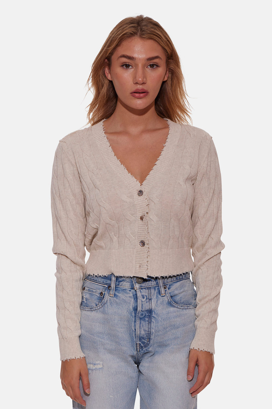 Introducing our Satya V-Neck cardigan, featuring a unique ribbed texture with frayed hem on the body, sleeves & neckline for a chic look. Perfect transition style going into the fall, made from a light weight 100% cotton.