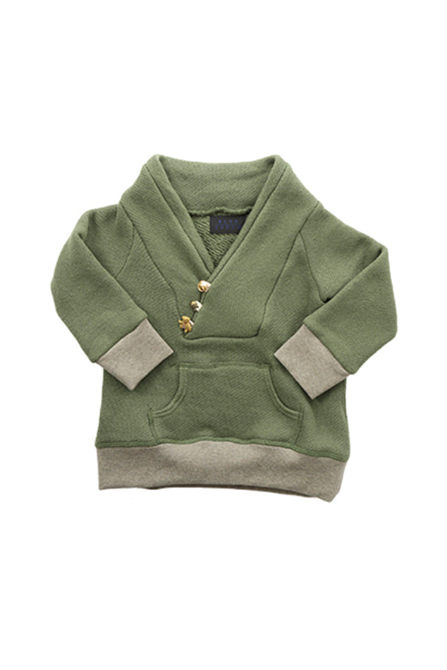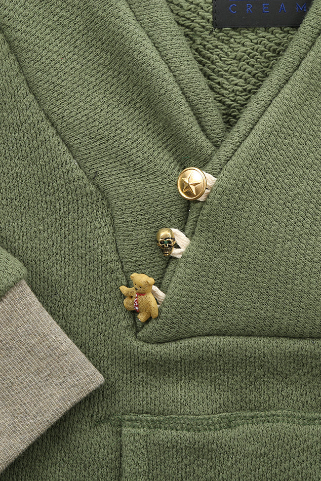Made from a specially dyed "Young Olive" organic recycled cotton and a cotton cashmere combo ribbing, this sweater is a lightweight loop weave composition. A randomly selected impossibly cute buttons that can include a skull stud, teddy bear, general bronze stars and studs, zebra and buffalo head gunmetal nickels.