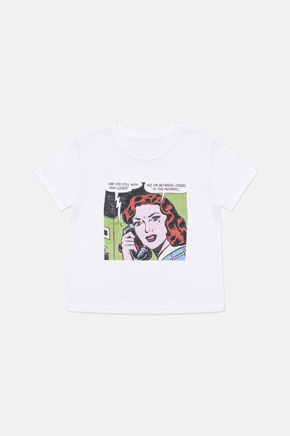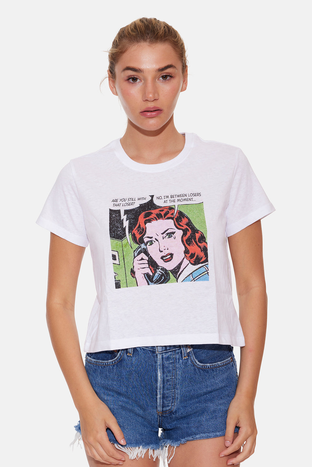 Exclusive Blue & Cream cropped graphic tee for a fun basic to add to your t-shirt collection. Pair with jeans, a cardigan or blazer for an elevated casual look!