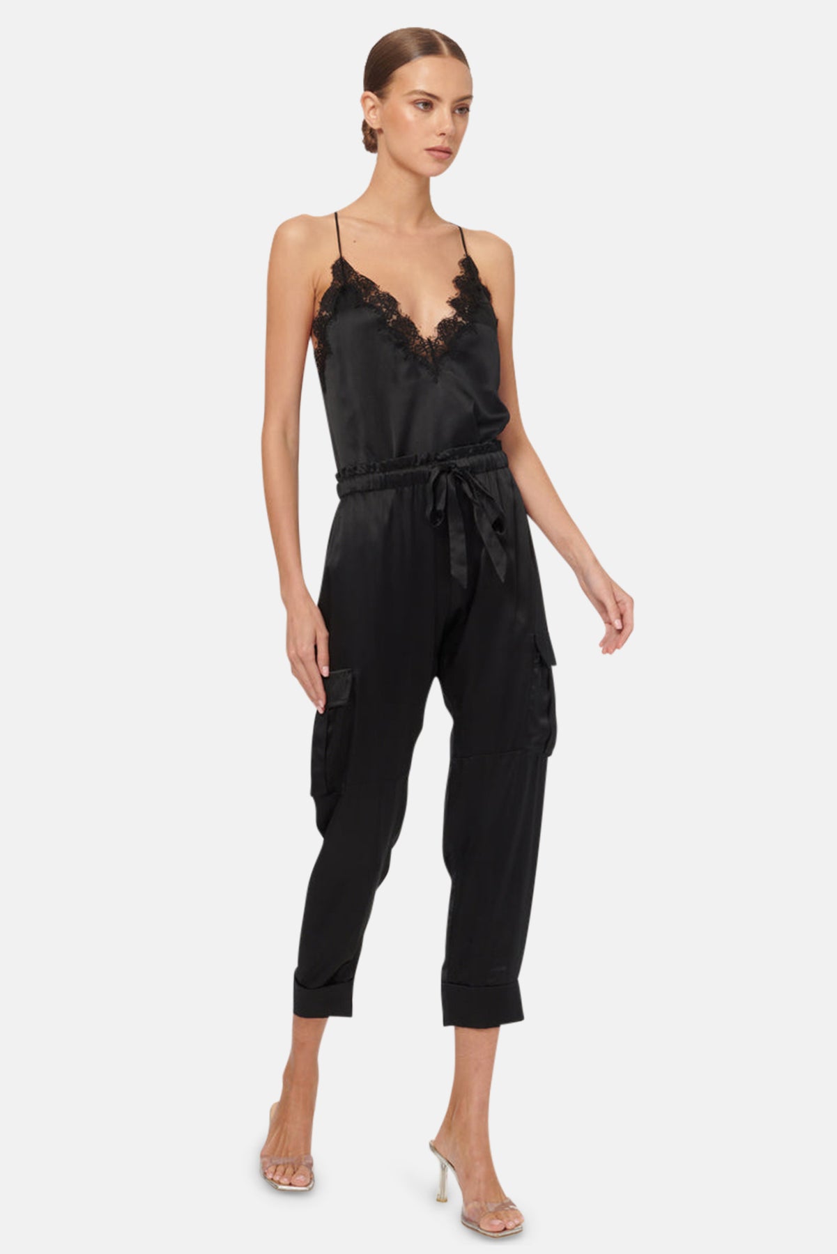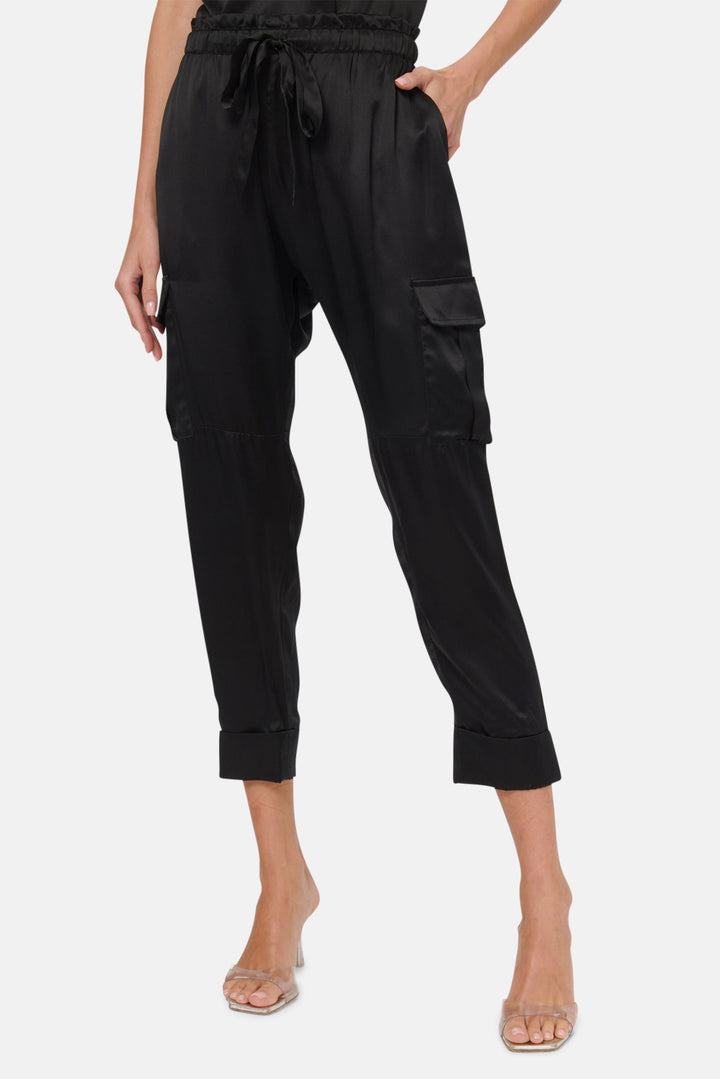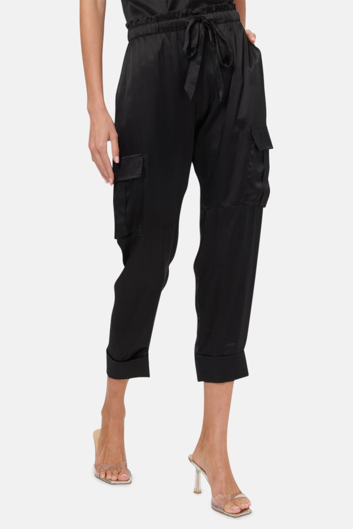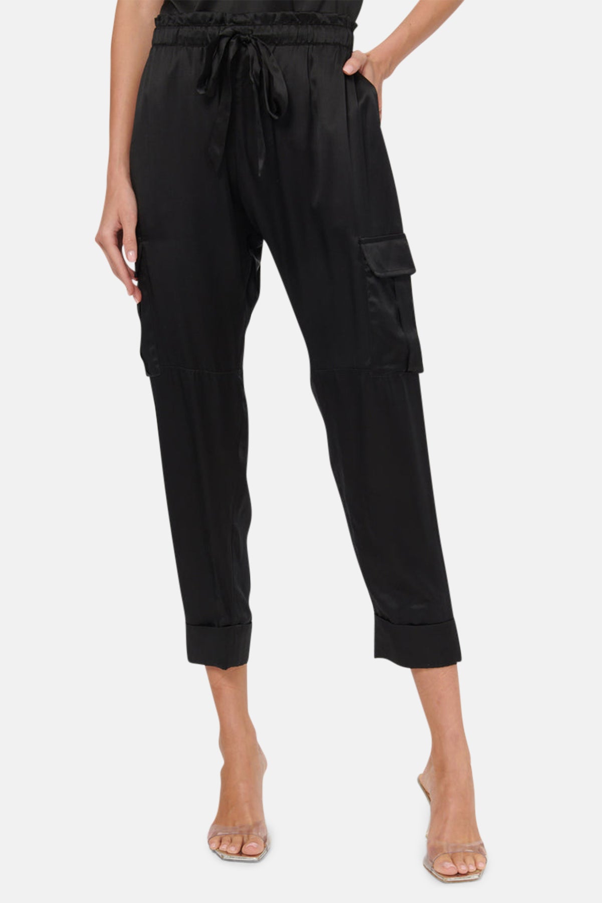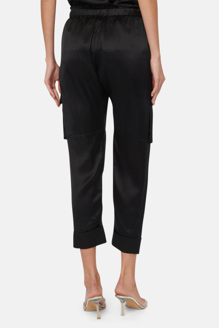 The Carmen is the silk trouser that will take you from day to night, desk to restaurant. The Carmen Cargo Pant is a sophisticated twist on the classic cargo pant and one of our most loved customer favorites! This stretch silk sandwash charmeuse pant features an elasticated waistband, a functional self-tie and ruffle detailing at the top edge. Combining comfort with an elevated style, it is a cropped-length pant with a rolled cuff and is finished with side cargo pockets with a flap closure.