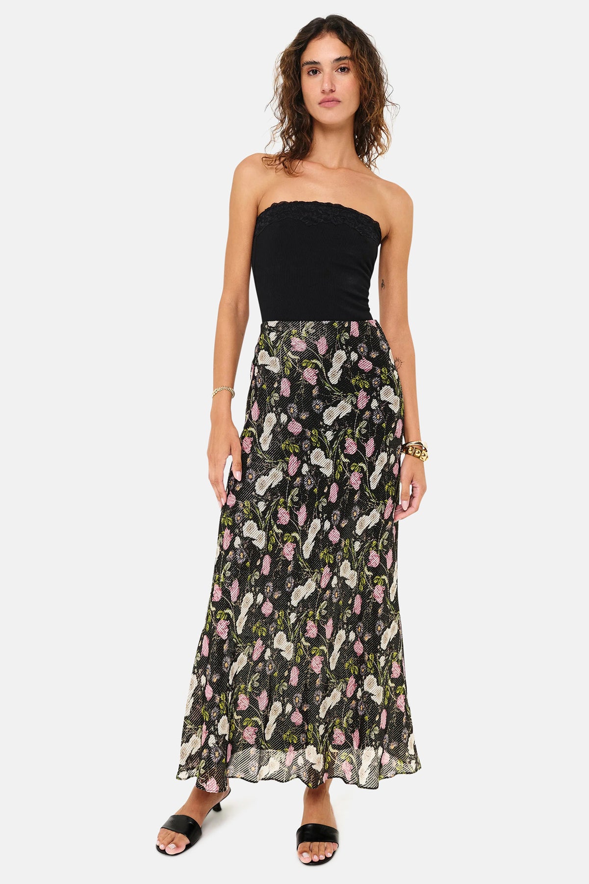 A strapless camisole in super soft rib knit, detailed with lace trim along neck edge lace and lace scallop that extends past rib edge.