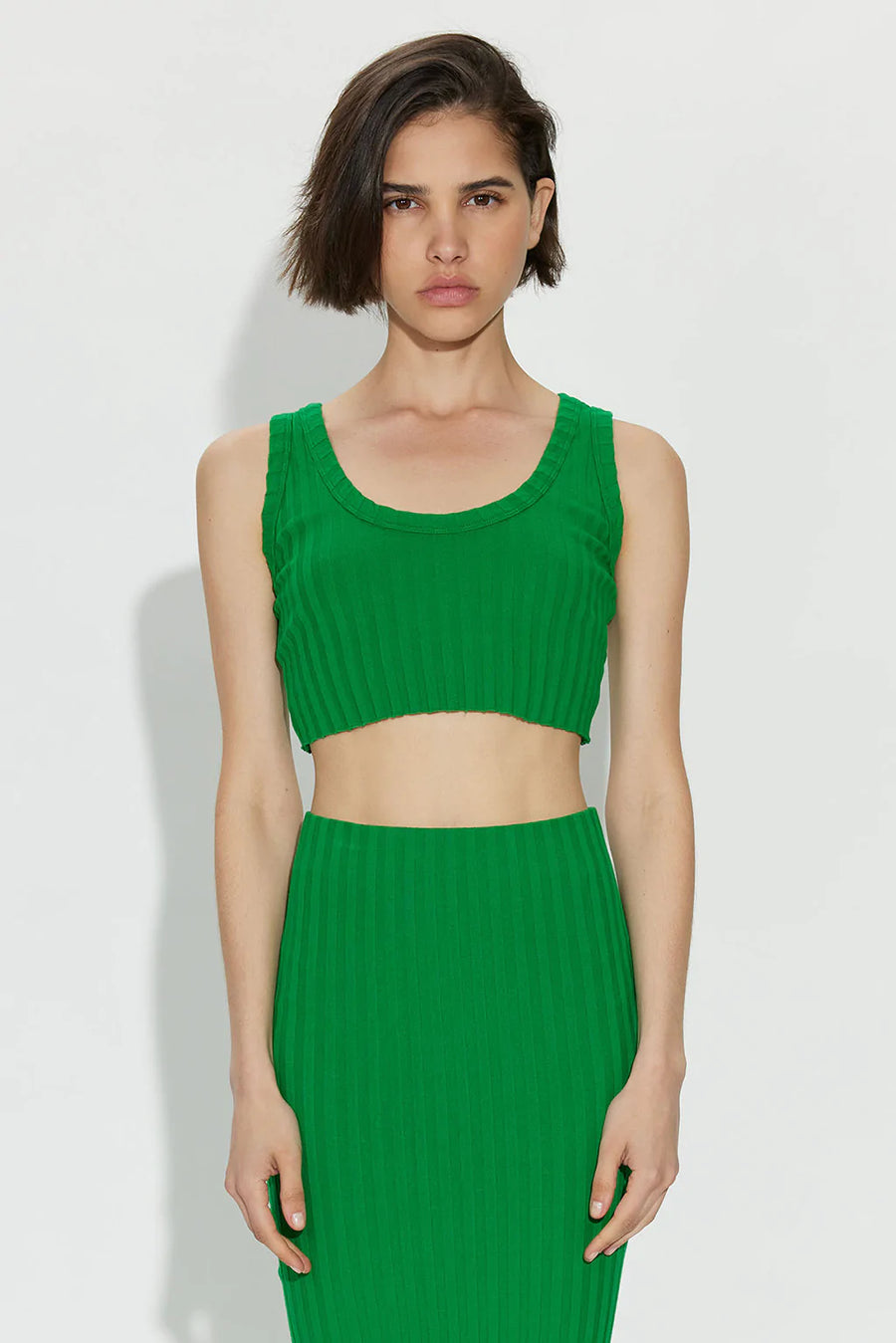 - Kelly Green- 94% Cotton, 6% Spandex- Form-fitting - Cropped - Scoop neckline - Raw hem - Wide rib- Style #: W1281165- Machine wash cold