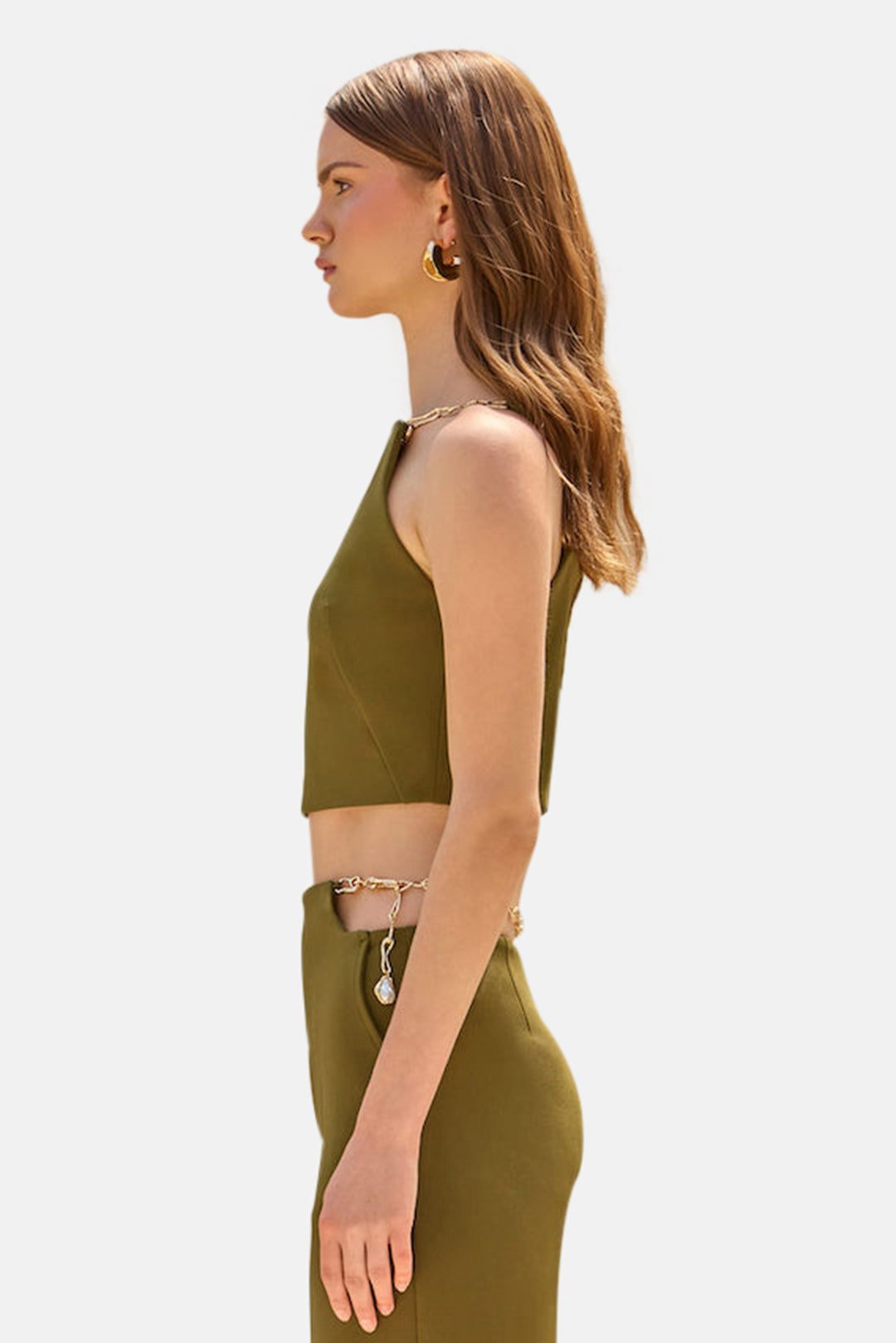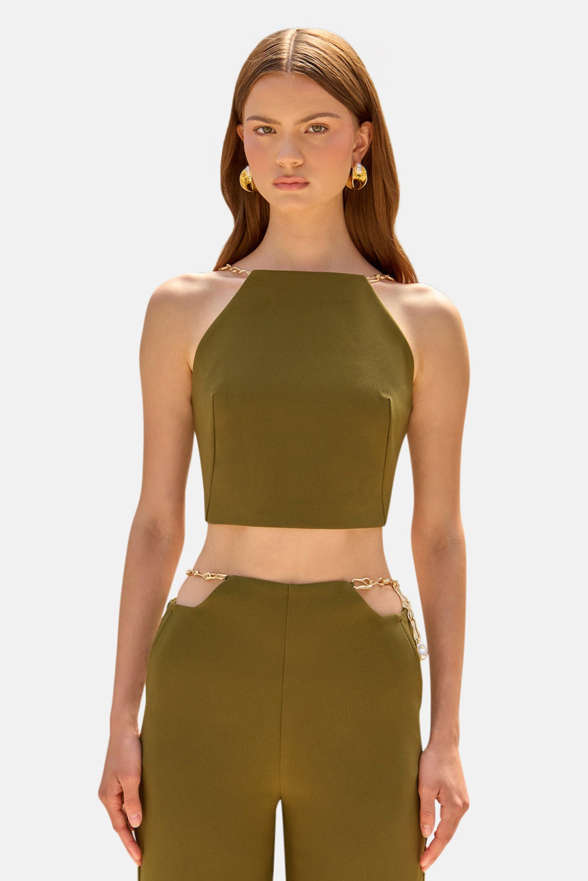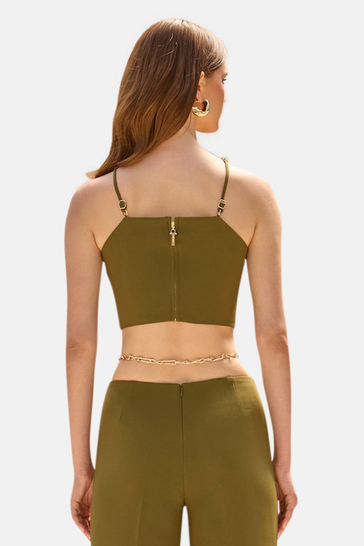A true waist sleeveless crepe top with adjustable chain straps and a back zipper