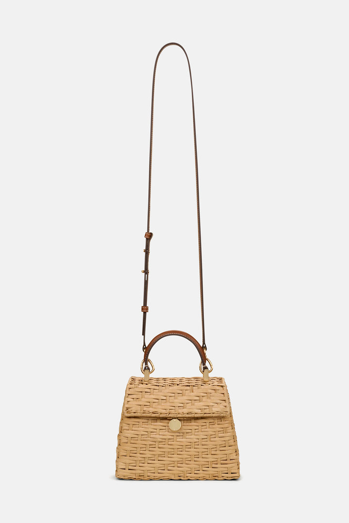 Crafted from wicker and smooth leather and lined in micro suede, a detachable smooth leather crossbody strap attached allows you to customize this as a clutch. Metal hardware at the closure and that connect the leather strap to the bag give a subtle glamour to this natural masterpiece. Feet on the bottom allows it to stand on its own. A magnetic snap closure keeps all of the essentials safe.