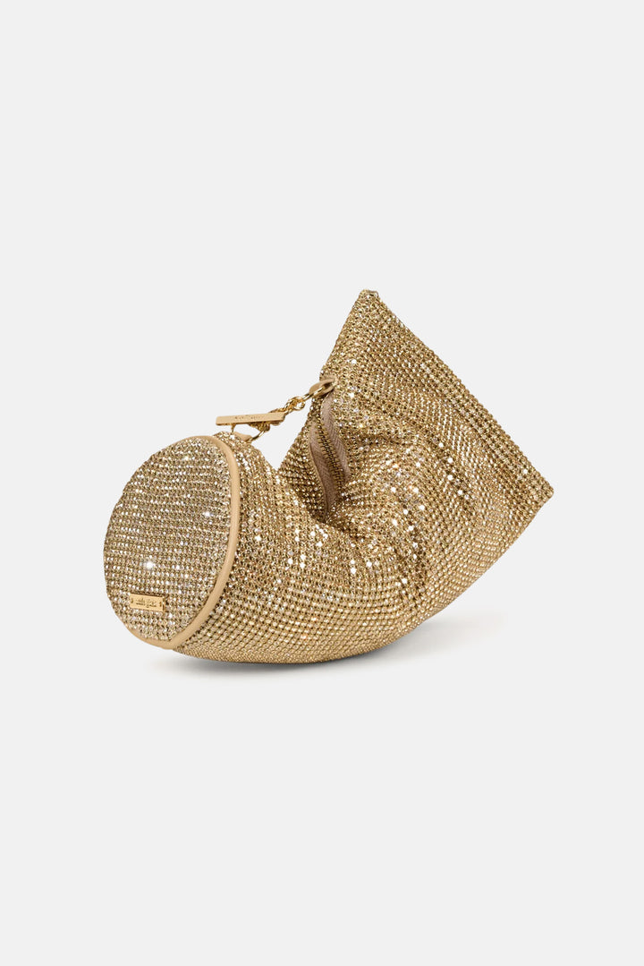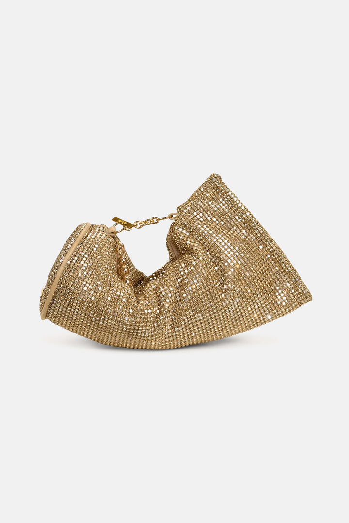 A rhinestone adorned clutch with silver-toned hardware and a zipper closure.