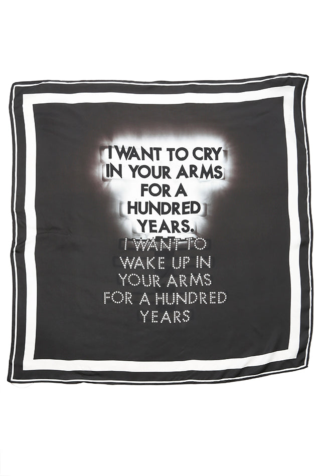 You'll be a showstopper in this photo silk scarf that features an inspirational quote and dramatic black and white radiant. Pair it with a plain white tee and denim to complement the tones of the scarf from sunset until sunrise.