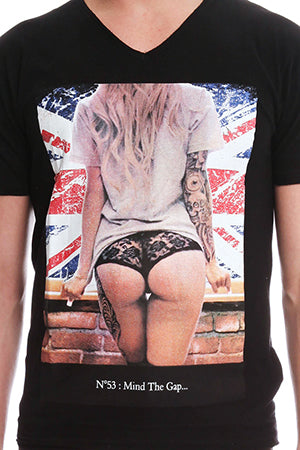 "Mind The Gap". This cotton blend V neck graphic tee incorporates every man's favorite gap. Let everyone know that you don't mind THAT gap. Style with a leather and a moto skinny and prepare for the fist bumps.