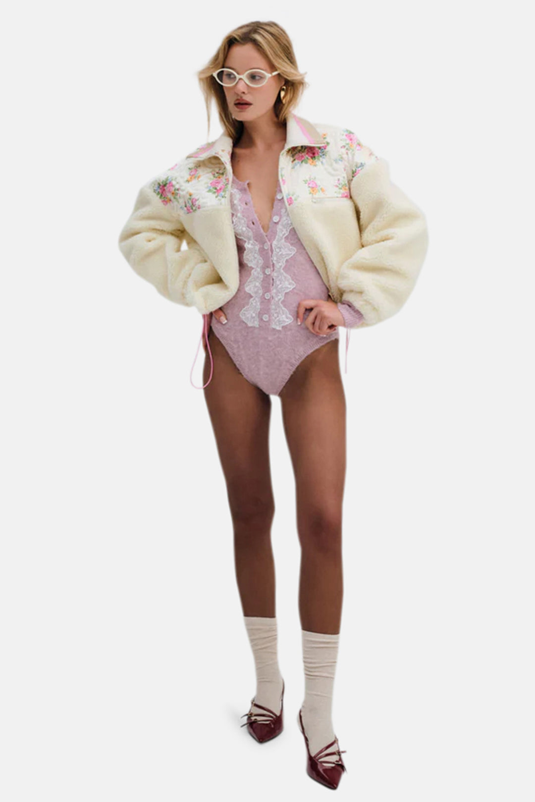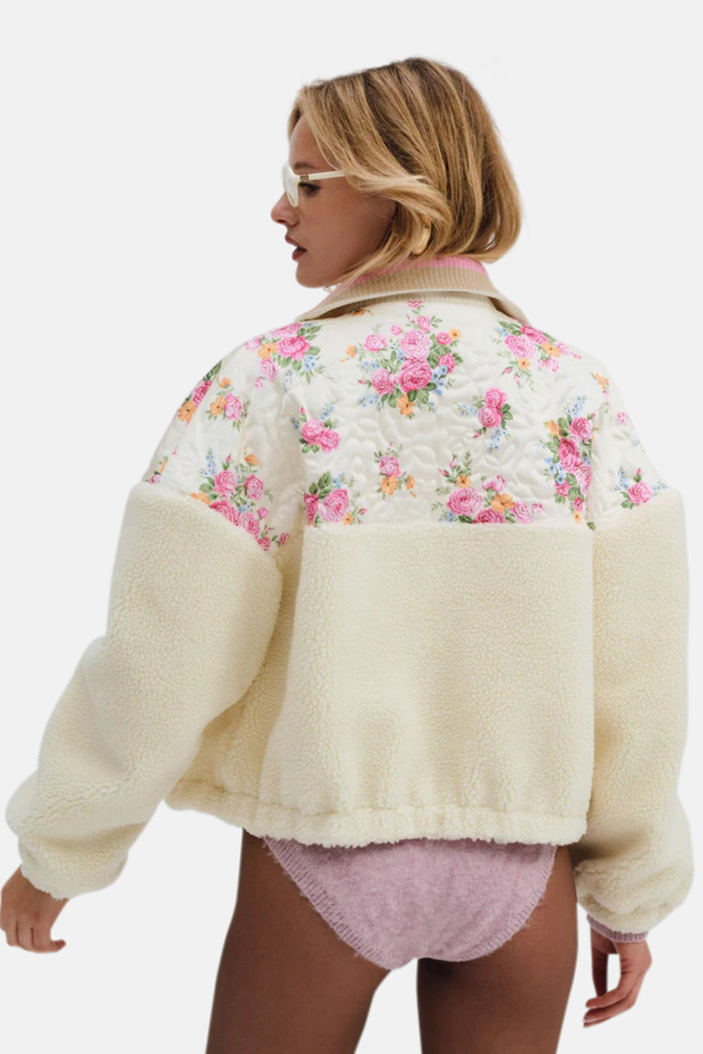 Your go-to cozy style for fall—the Sadie pink fleece jacket is crafted in a quilted floral with contrast blue sherpa. This oversized women's fleece spotlights a contrast ribbed collar, a functional zipper at the front, and a welt pocket at the front chest.