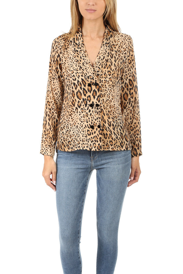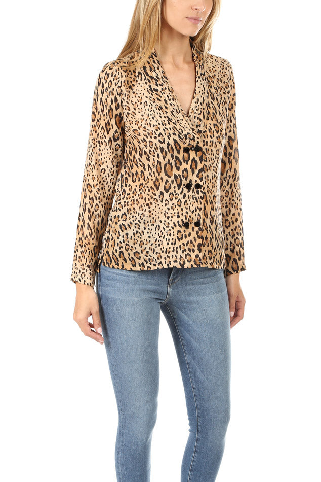 Elevating the blouse with a bit of blazer style, this button down features a double breasted closure, finished with a pleated shawl collar for an innovative approach to a classic look. Crafted from cheetah print crepe, this singular aesthetic fits a stand out feel.
