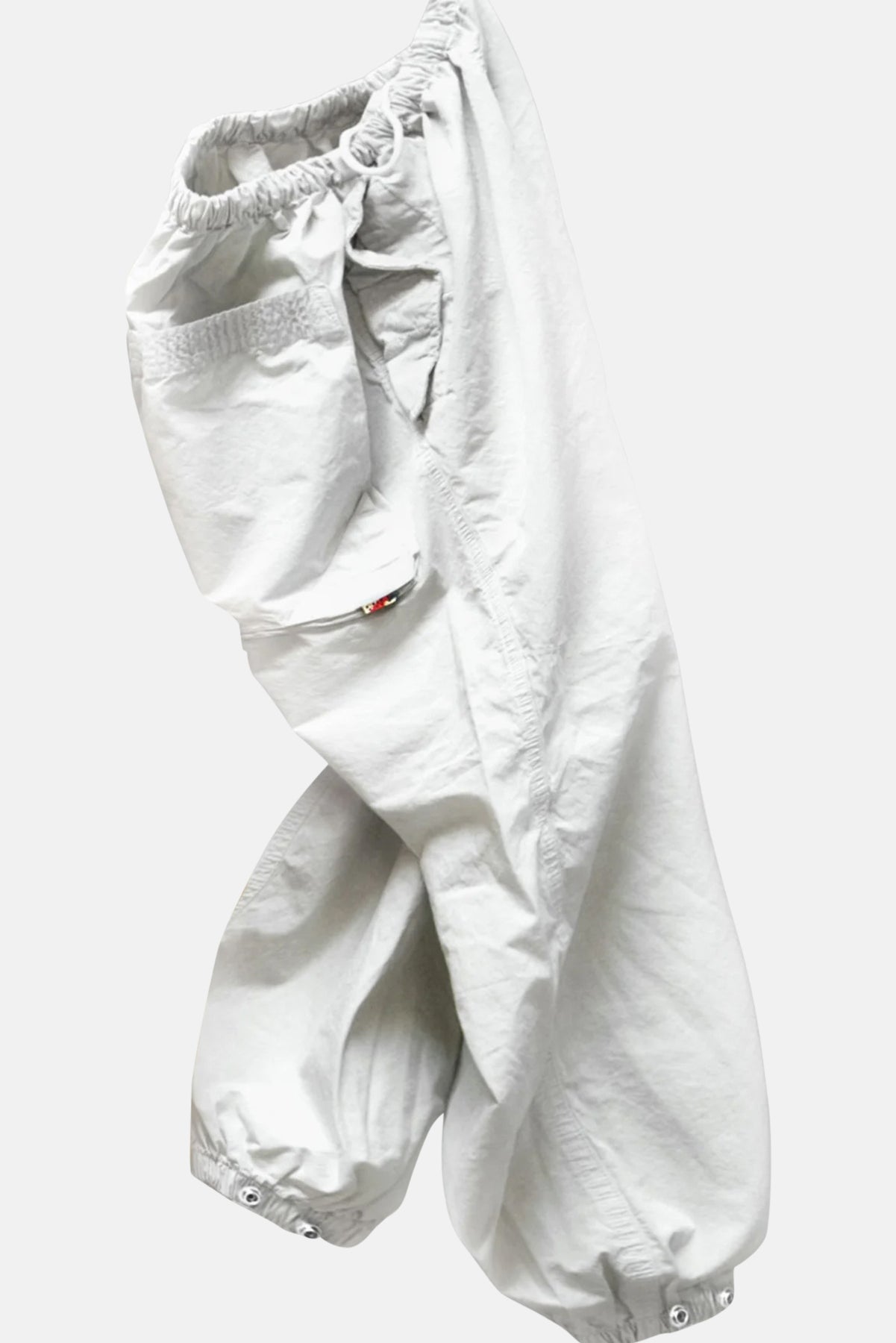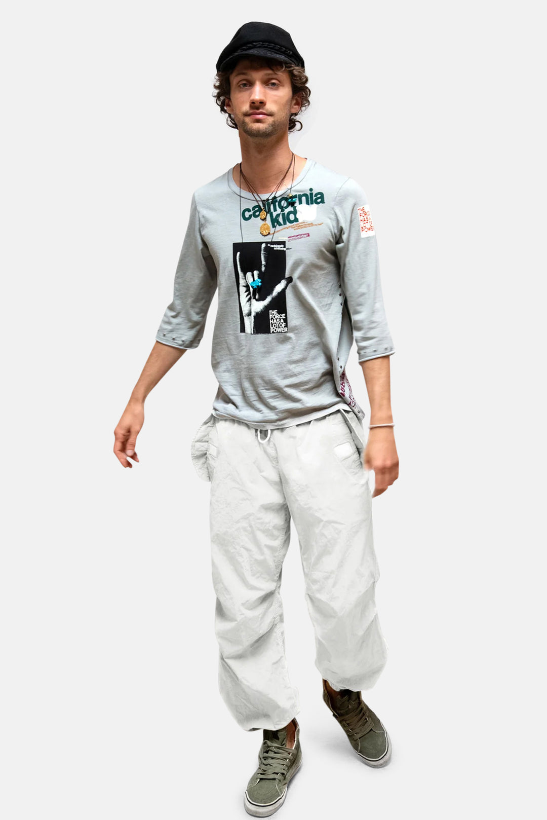 Unisex FLAP/SNAP POPLIN/AIR pant in custom green dirt powder with custom sunfade wash (highs and lows), custom 3d back pocket, snaps on bottom hem, and elastic waist with pull draw-cord.