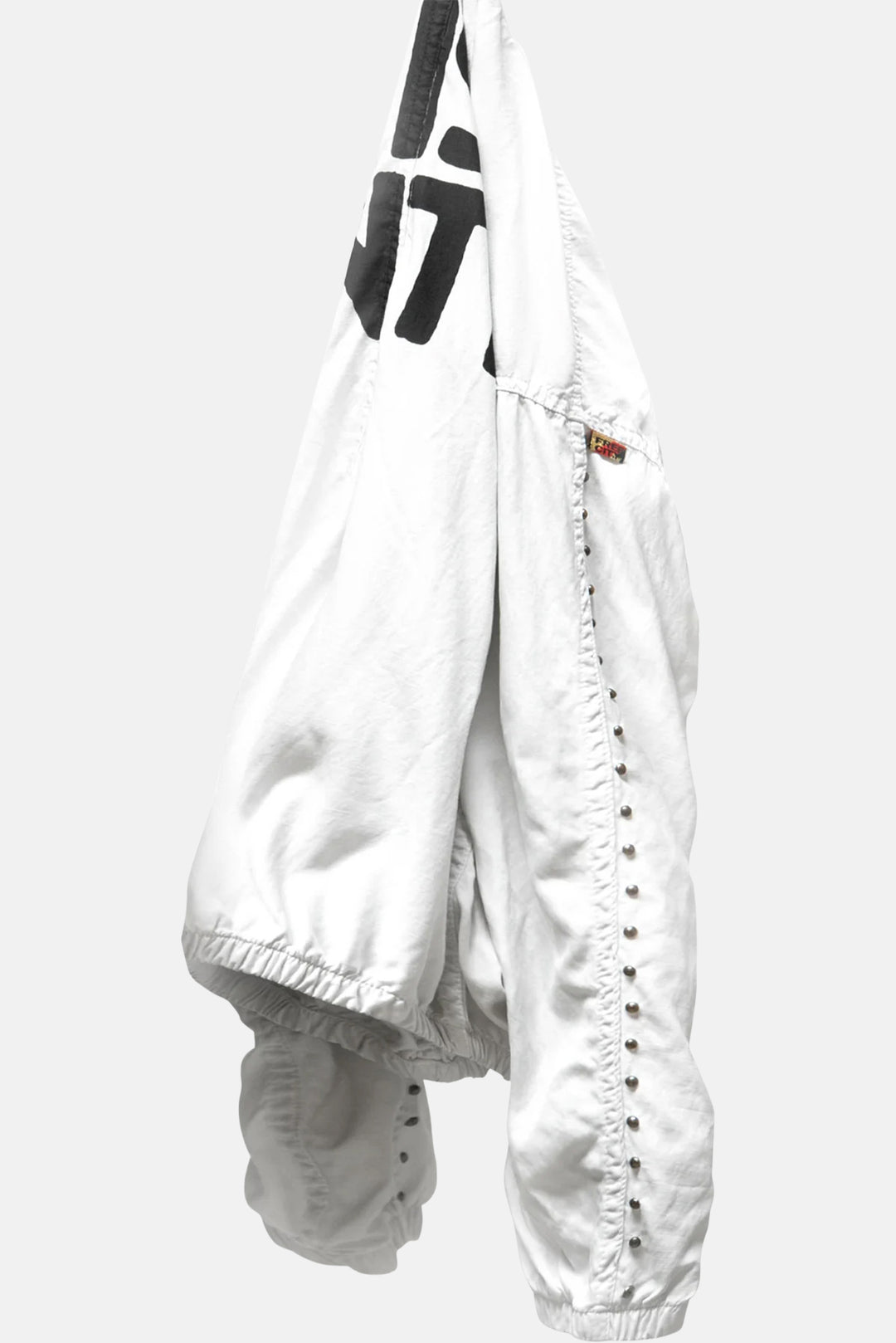 Unisex MATTE/SATIN AIRJUMP bomber shell jacket in surplus powder with custom sunfade dye (highs and lows) hand-screen "ARTISTSWANTED" print on back. HOME/STUD with vintage silver studs down the sleeve. Relaxed fit with dropped shoulder and tapped seams.