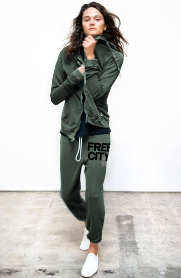 - Unisex SUPERFLUFF LUX OG sweatpant in bush with classic “FREECITYLARGE” print and gray "FREECITYDOVE," covered elastic waist band with pull drawstring.