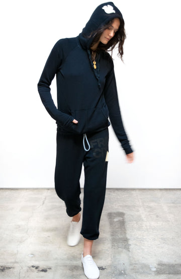 - Unisex SUPERFLUFF LUX OG sweatpant in deepspace with classic “FREECITYLARGE” print and cream "FREECITYDOVE," covered elastic waist band with pull drawstring.