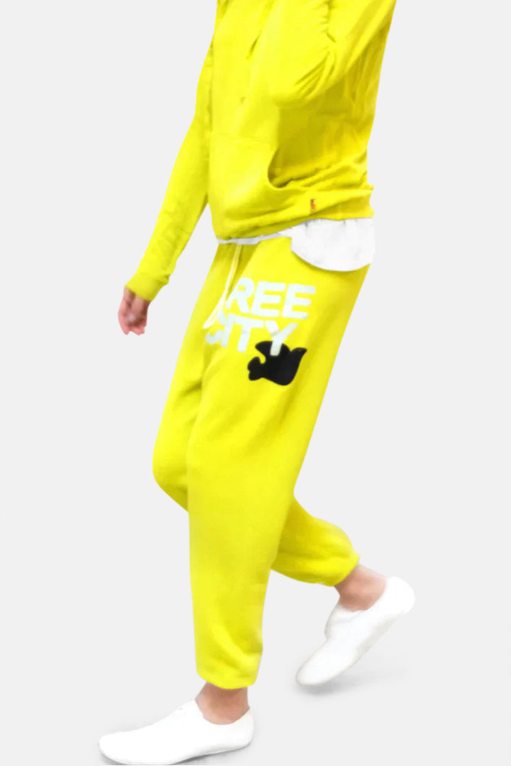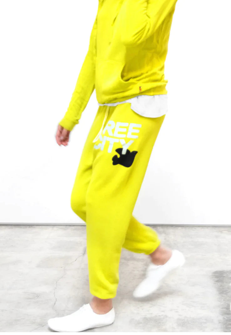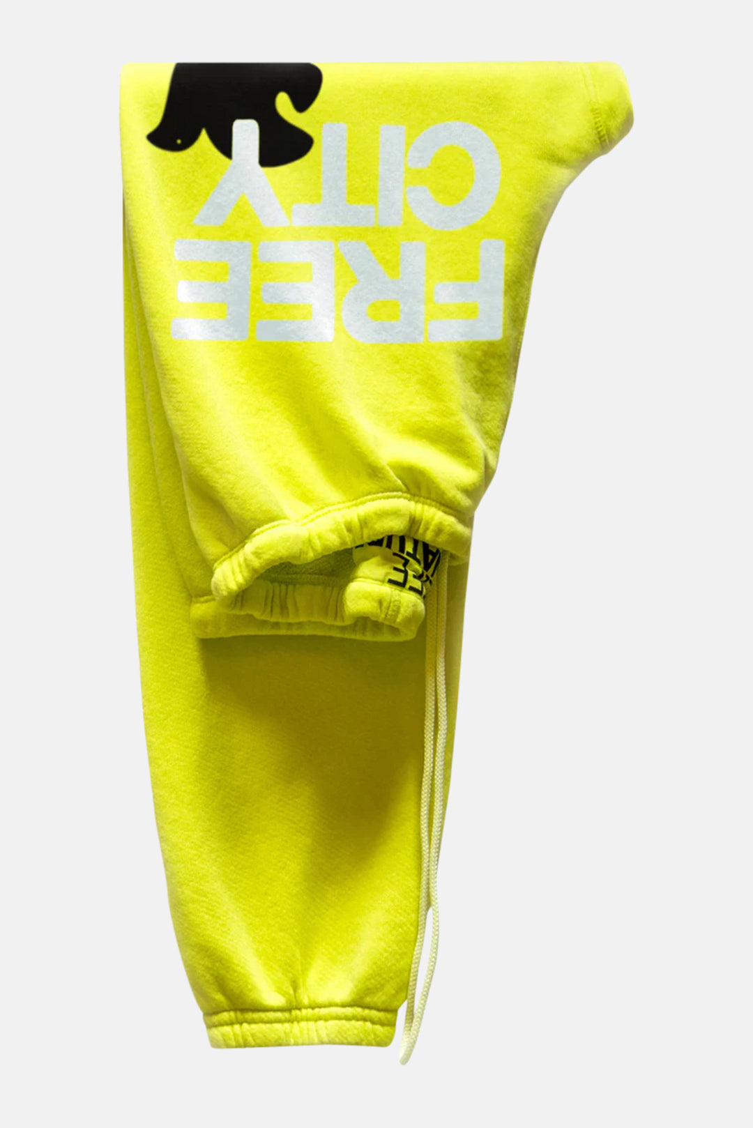 Unisex SUPERFLUFF LUX OG sweatpant in glowlight yellow with classic “FREECITYLARGE” print and black "FREECITYDOVE," covered elastic waist band with pull drawstring.