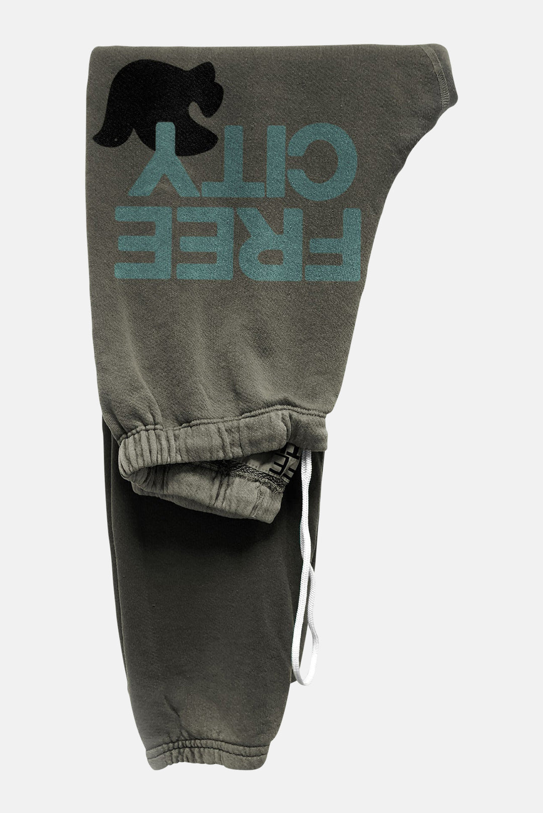 - Unisex SUPERFLUFF LUX OG sweatpant in mushrooms with classic light green “FREECITYLARGE” print and black "FREECITYDOVE," covered elastic waistband with pull drawstring