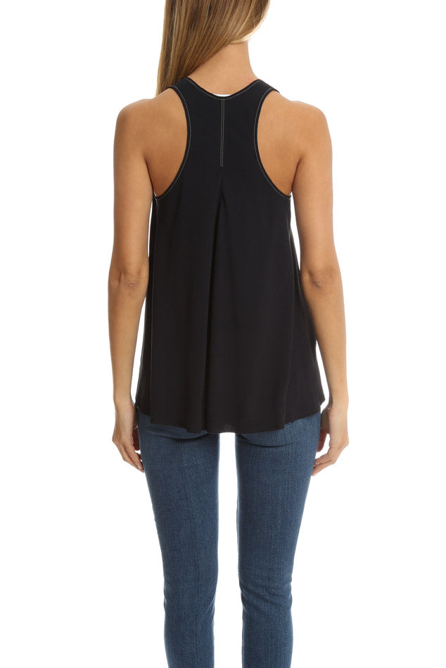 An A line silhouette gives an effortlessly sophisticated vibe to this flowy tank. Slit pleating in the back creates extra movement and contrast stitching brings a cool, casual edge.