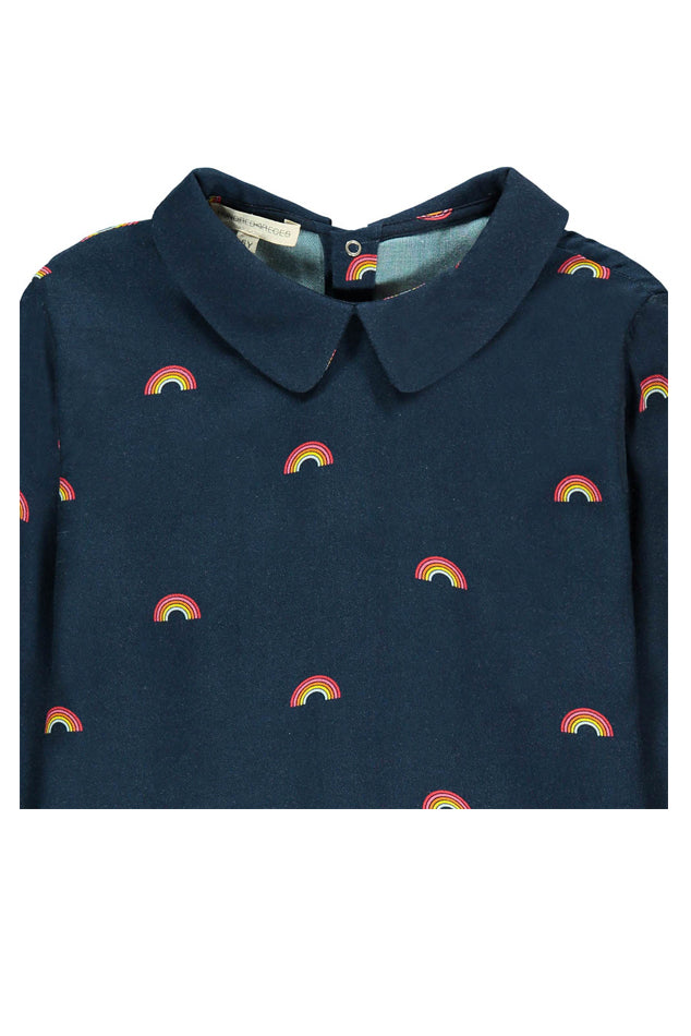 This collared blouse features an adorable rainbow print and snap cutton closure down the back.
