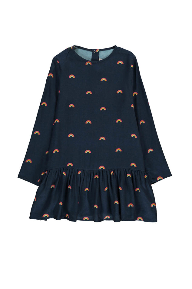 This flowy dress features an adorable rainbow print, mother of pearl snap button closure down the back, and a frilled skirt hem.