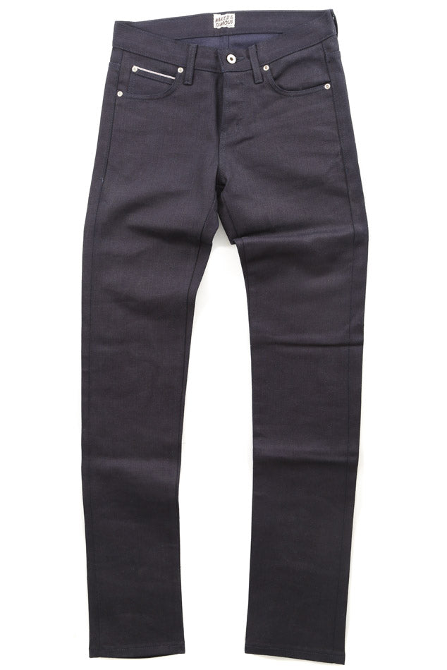 Slim fit jean in a super lightweight 8 oz denim. Tonal indigo on indigo fabric for a deep blue color.