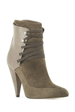 A suede and leather mix is accentuated with a mid lace up design. Similar to it sister style The Kitmei, these booties have a lighter leather lining to finish this feminine look.