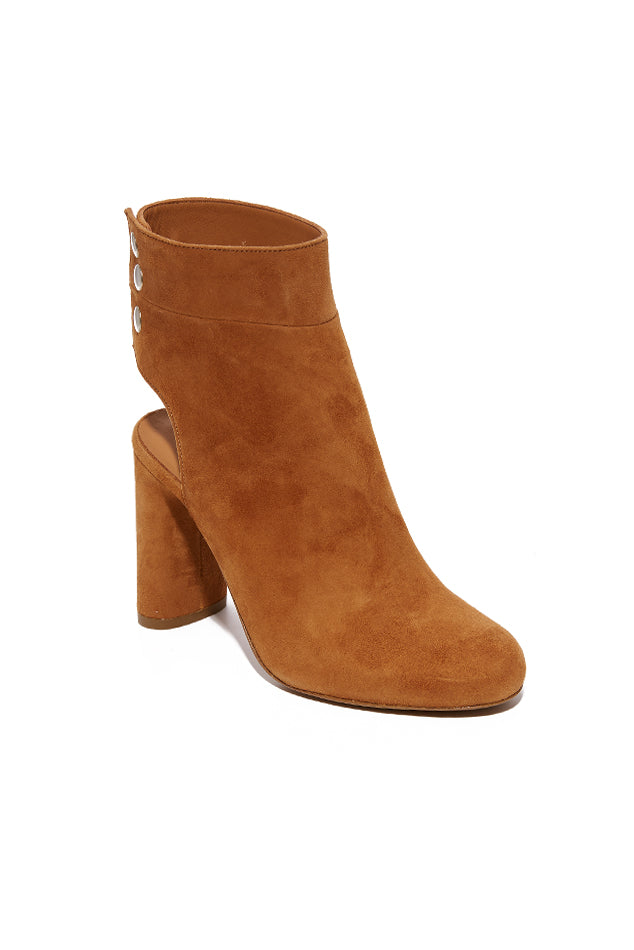 Versatile suede cutout bootie with three silver snaps at the ankle cuff. Ovular shaped heel, leather sole.