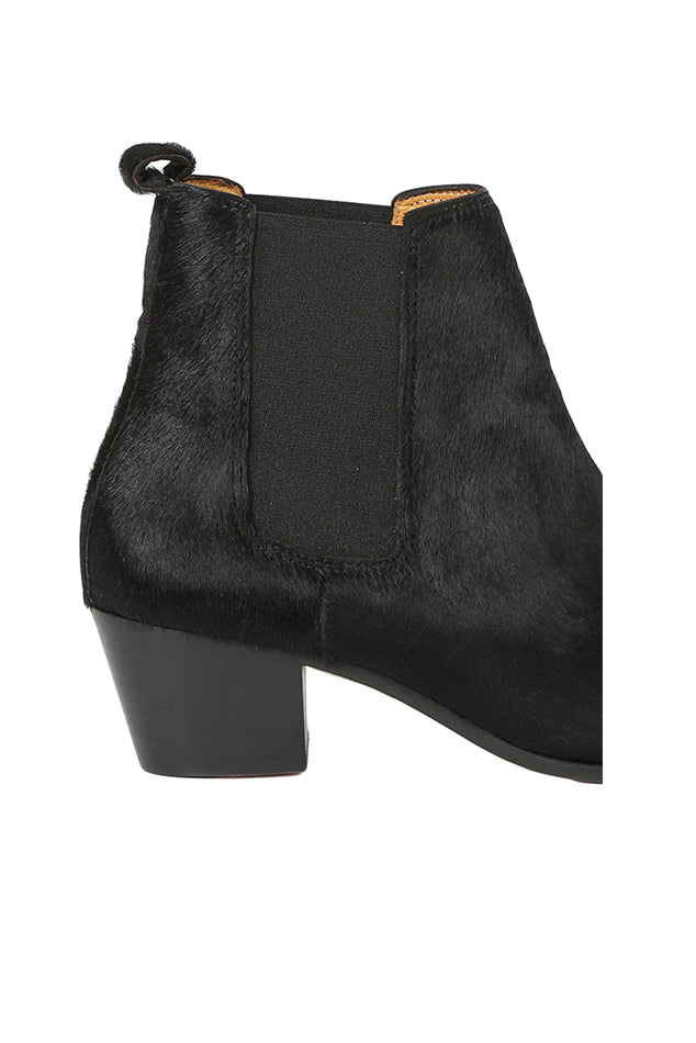 IRO's latest take on the classic chelsea ankle boot features a leather upper coated in black calf hair for a luxurious take on a timeless style. Elasticated side gores, pointed toe, stacked heel.