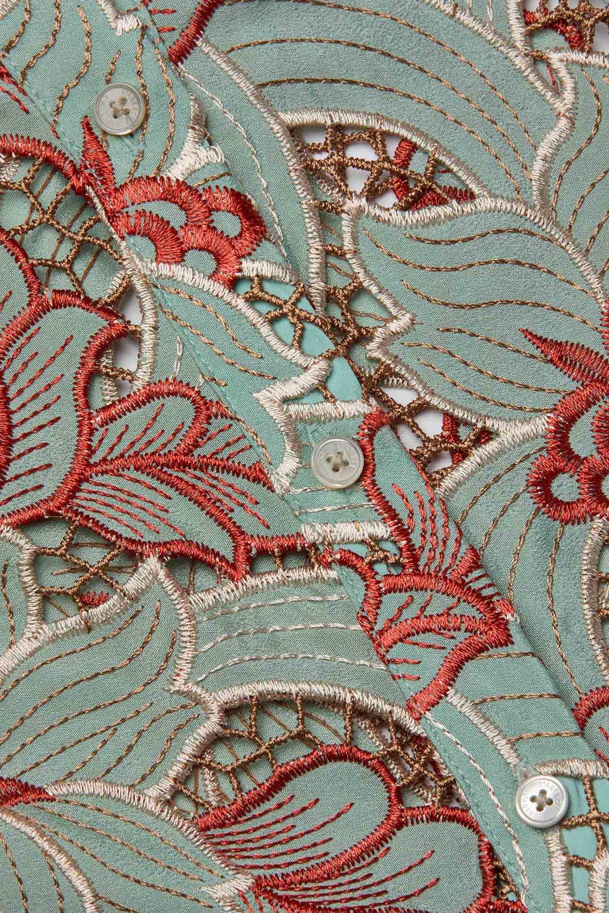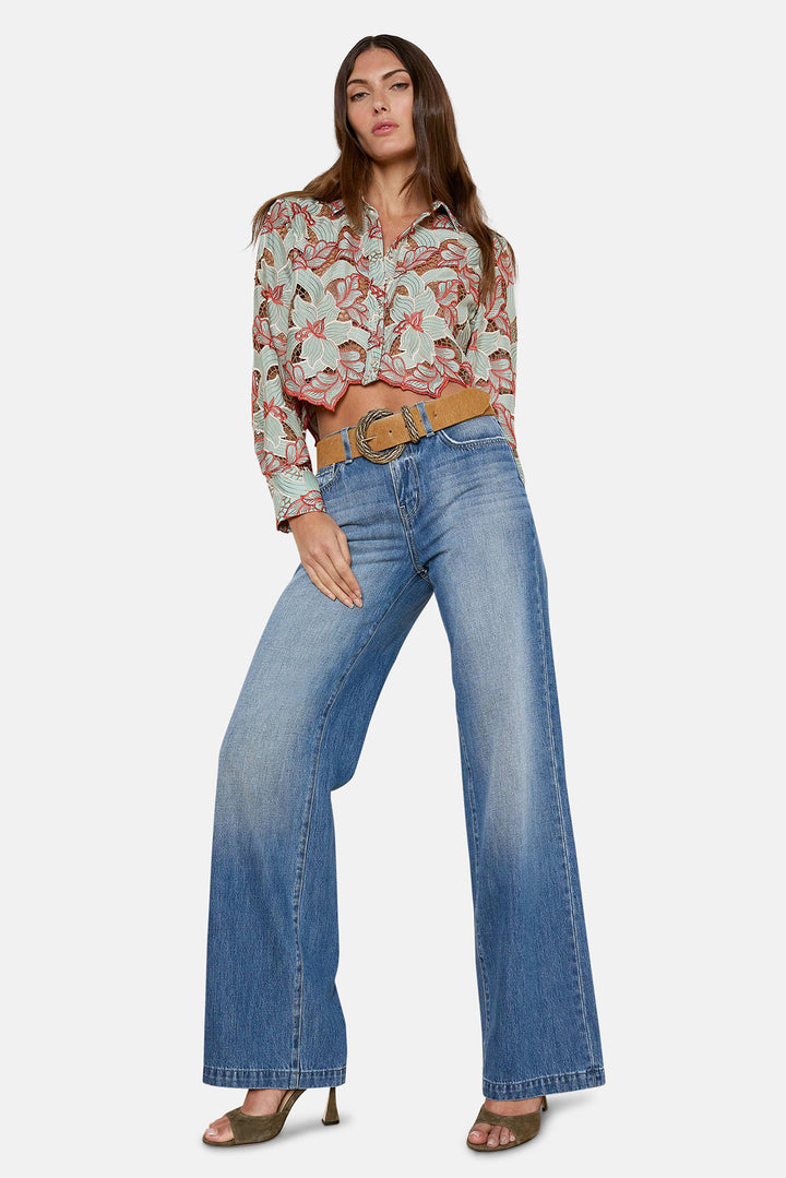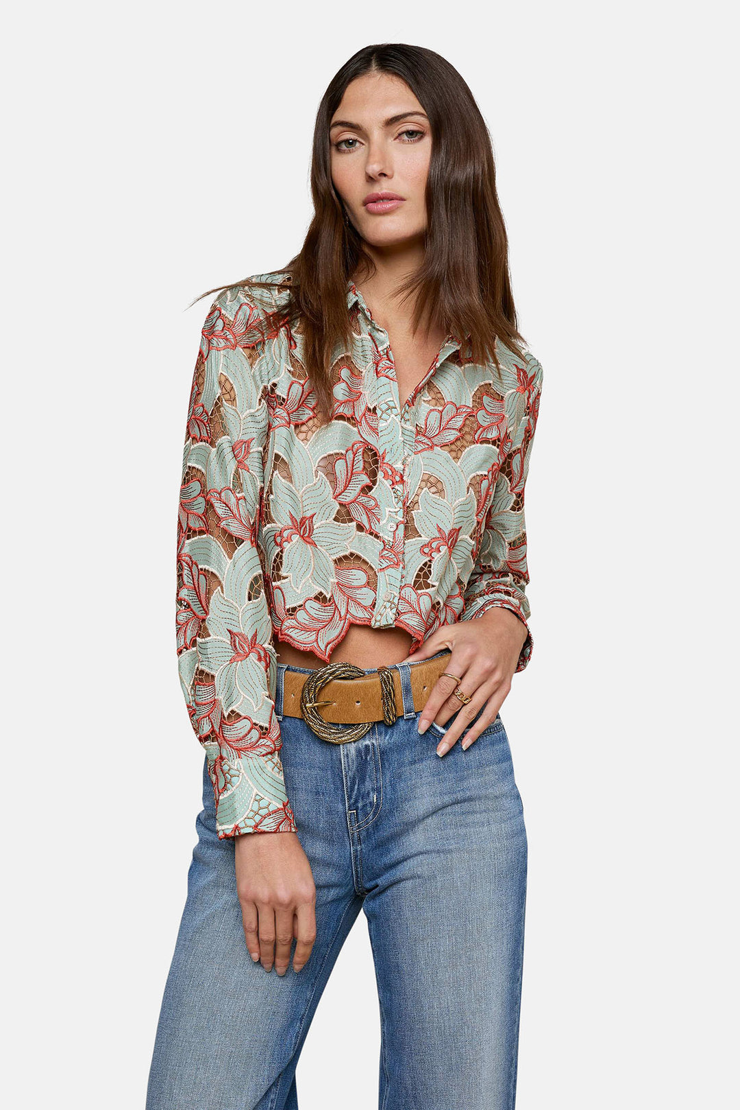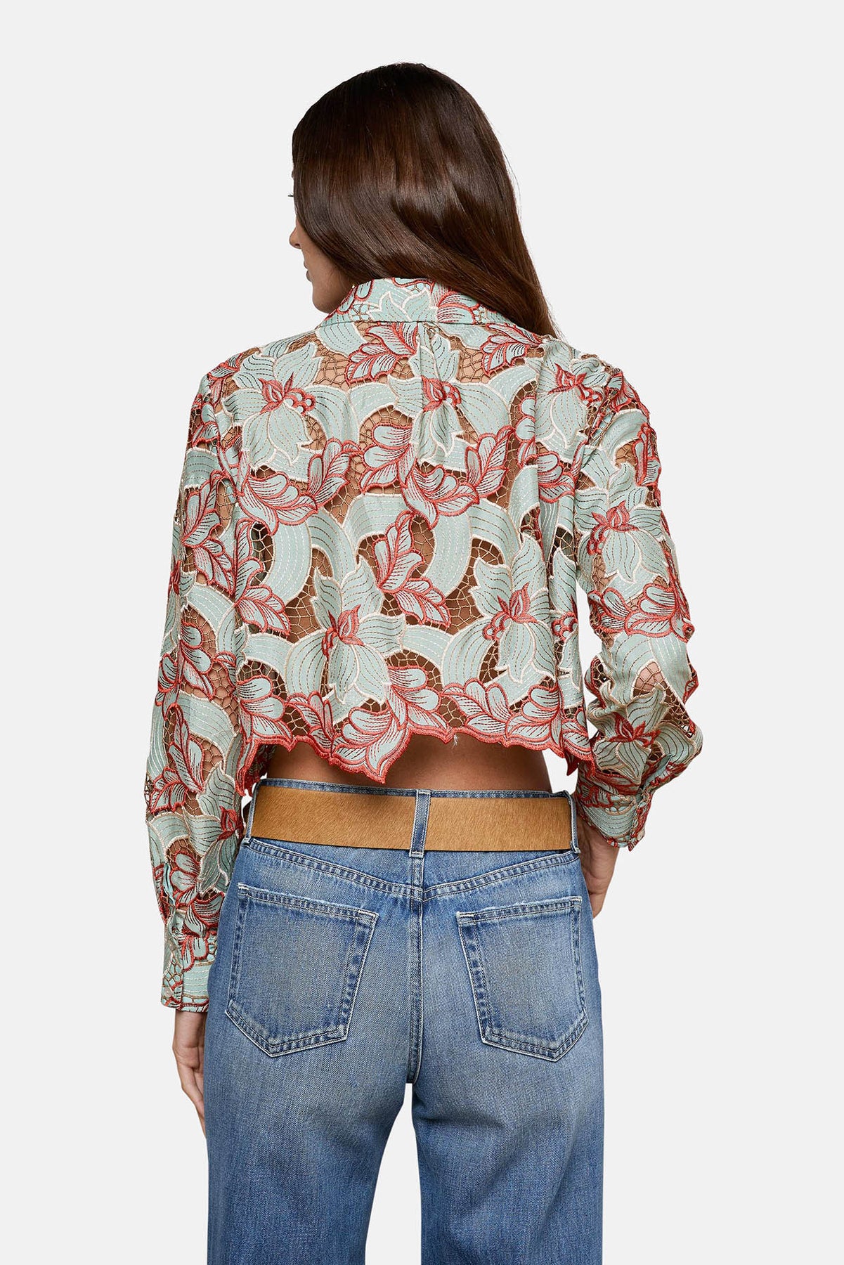 The Akemi is a cropped button-up shirt crafted from eyelet lace, featuring bold floral motifs and contrasting red embroidery. Finished with a scalloped hem, it’s a statement piece that blends feminine detail with modern edge.