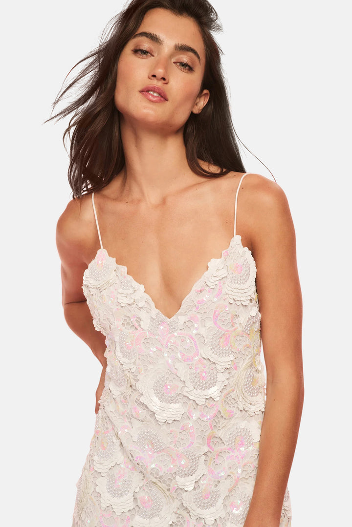 Ethereal and intricate, this elevated mini features chemical open lace at the base with a beautiful arrangement of gorgeous, floral embellishments featuring pretty pearls, iridescent sequins, and shimmering payettes, all making up this textural, three-dimensional adornment. With a fitted silhouette, the piece is finished with delicate spaghetti straps with extension, a side seam zipper, and comes lined.