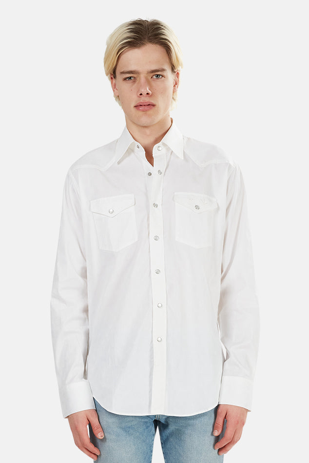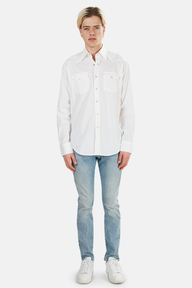 Fine, luxurious Japanese cotton is dressed up in a western style button down shirt. Metal snap buttons at the front, dual chest pockets, and three button arm closure ode to a vintage American style.