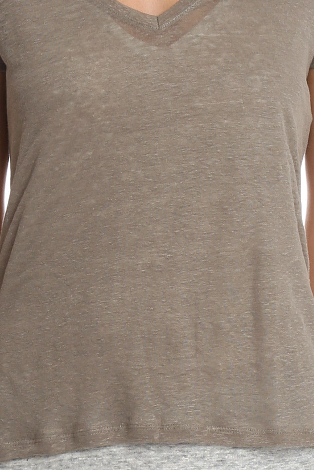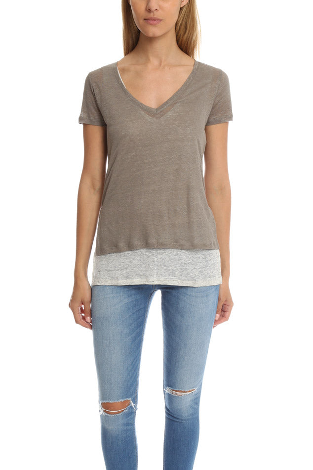 Essential double layer v-neck linen tee from Majestic Filatures. Tank style underneath drops just below the t-shirt to offer the ultimate combination of comfort and cool.