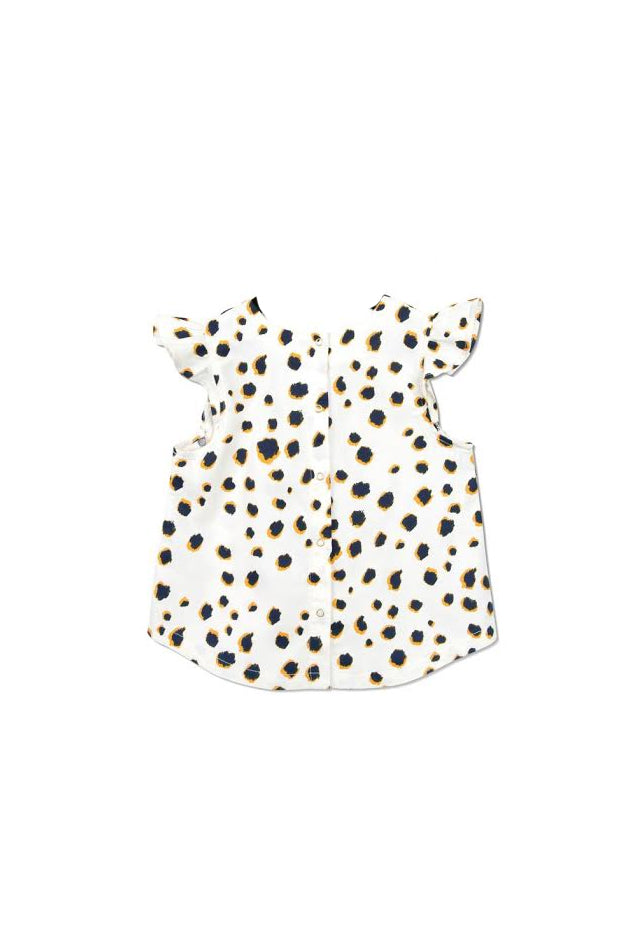 Mini Rodini's soft organic cotton short sleeve woven blouse with print. Features frill wing detail at sleeves with a press button back closure. Fits true to size.