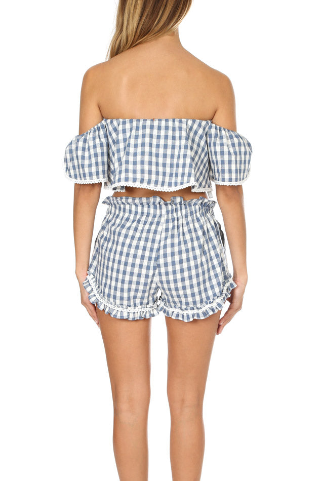 Fit for the chicest social butterfly, this gingham blouse flutters effortlessly off the shoulder and is finished with crochet trim. Paired with MISA's Leticia shorts or on its own, this draped crop top is made for the girl who knows how to have fun.