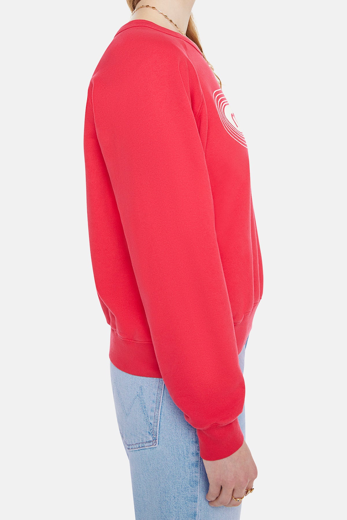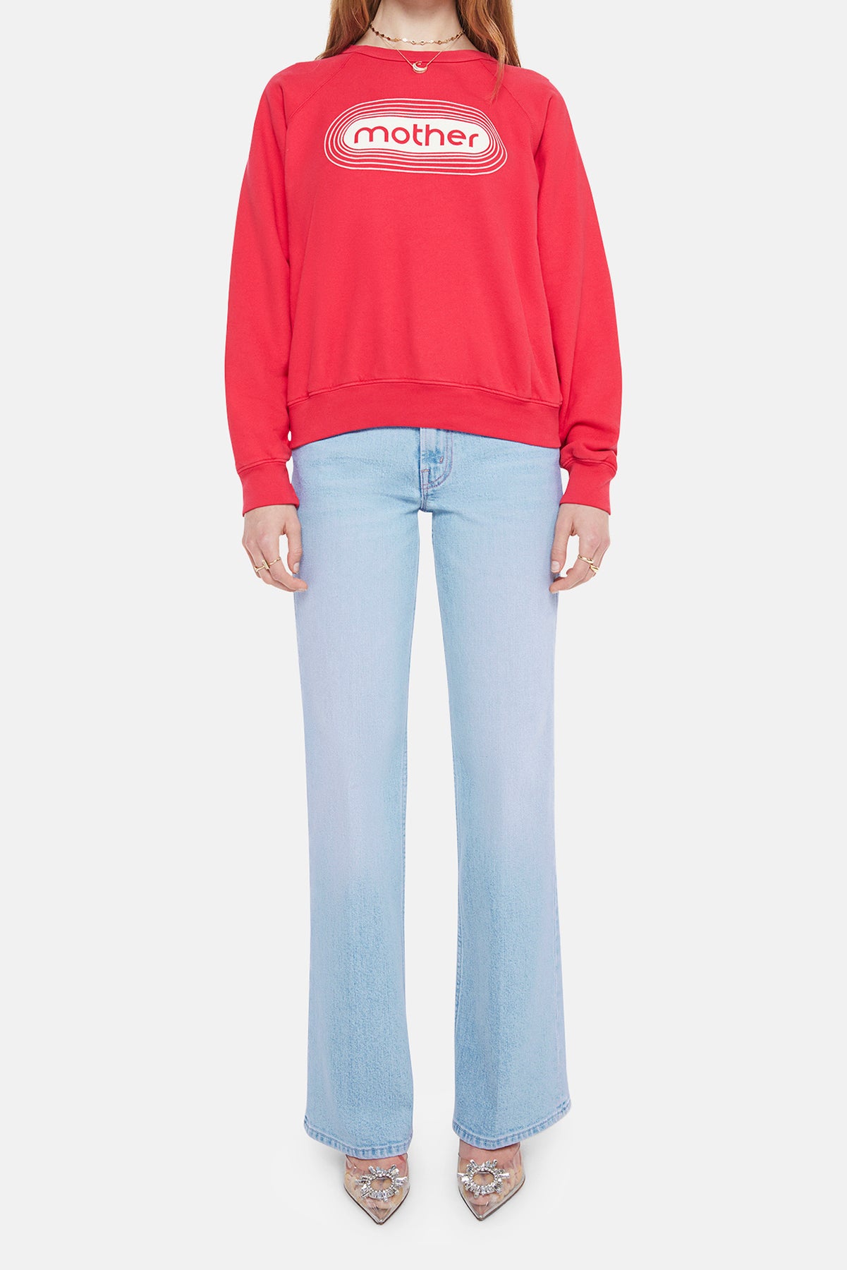 Tune in. A raglan sweatshirt with a crewneck, ribbed hems and a slightly oversized fit. Made from super-soft 100% cotton, the sweatshirt is designed in red with a white text graphic and MOTHER's name on the front.
